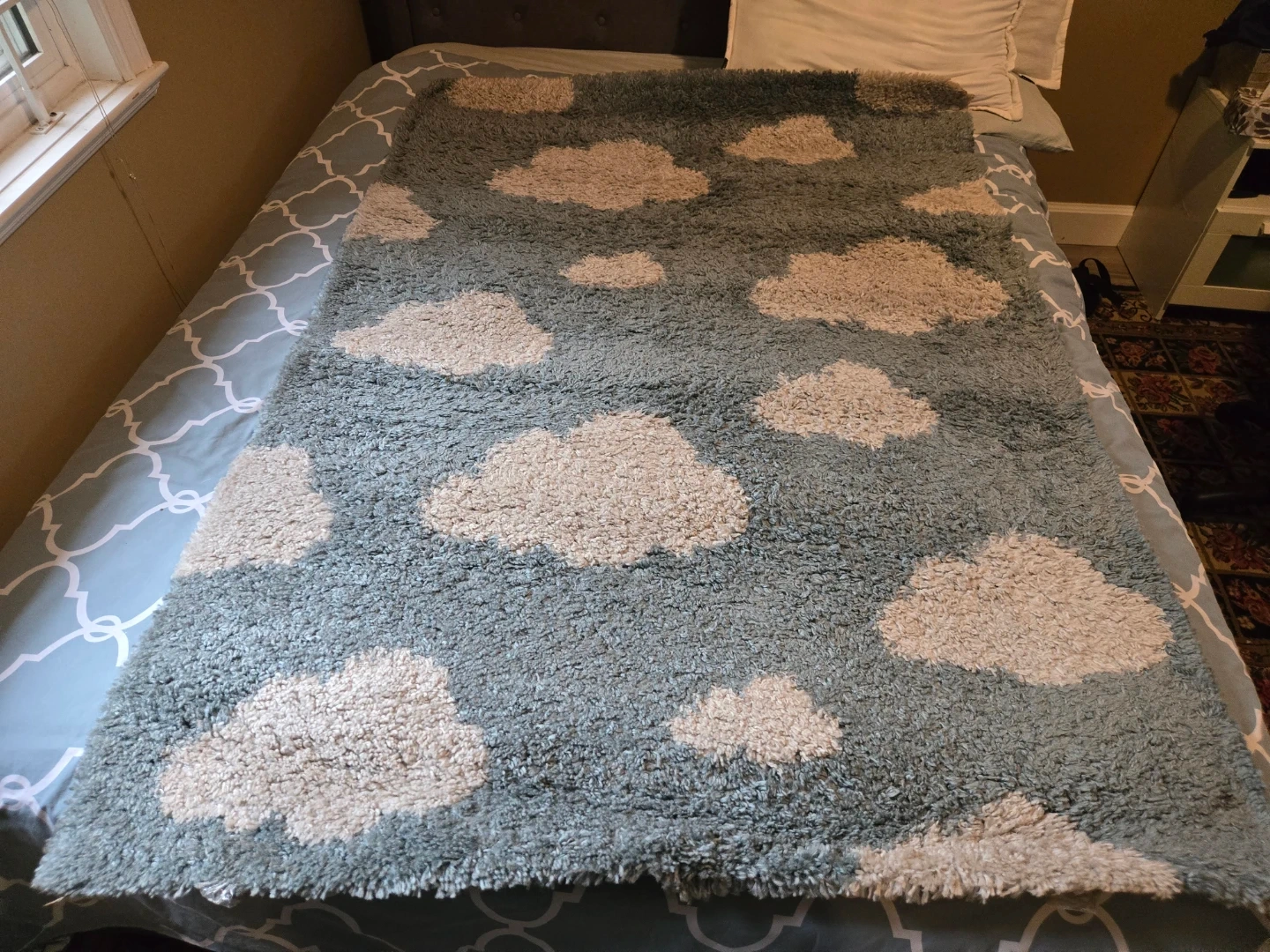 10Selling a cute shag rug with a cloud pattern! It's a lovely light blue colour and would be perfect for a kid's room or any space that needs a touch of whimsy. It's in great condition!