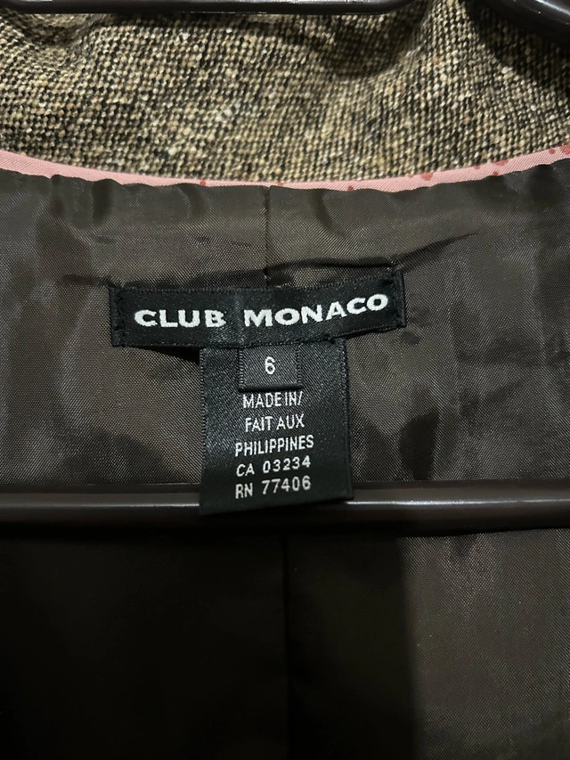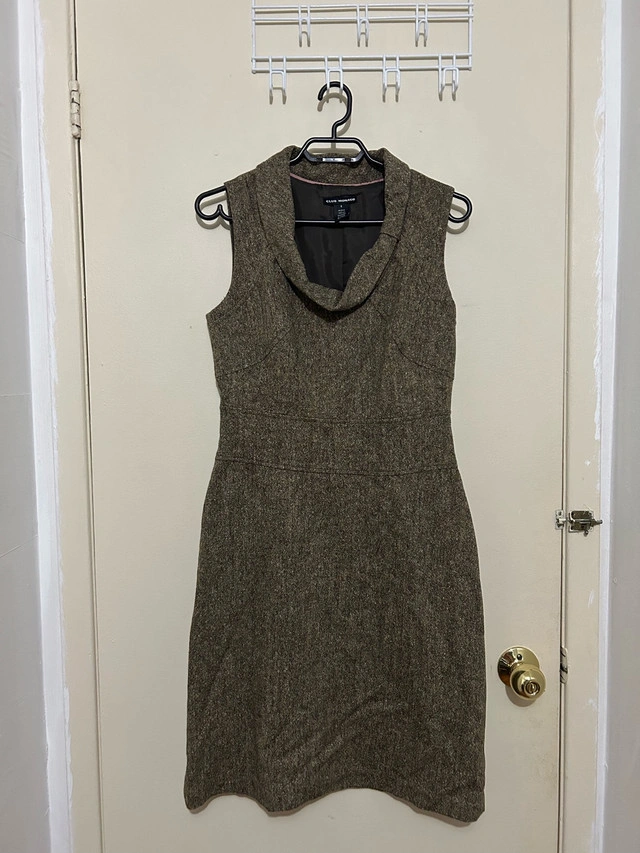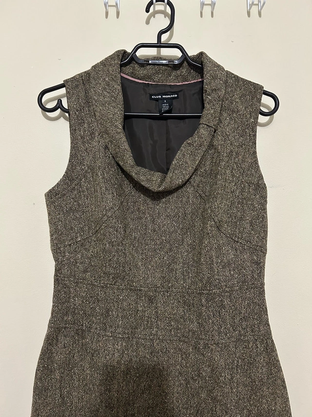 15This stylish Club Monaco dress features a sophisticated cowl neck and a flattering sleeveless design, perfect for both office wear and evening events. The dress is a size 6 and comes in a beautiful brown tweed fabric, offering a classic and timeless look. The dress is in good condition. Specifications: * Brand: Club Monaco * Size: 6 * Design: Sleeveless with Cowl Neck * Material: Tweed * Colour: Brown Looking to add a touch of elegance to your wardrobe? This dress might just be what you're looking for! Don't miss out—if the ad's up, it's up for grabs!