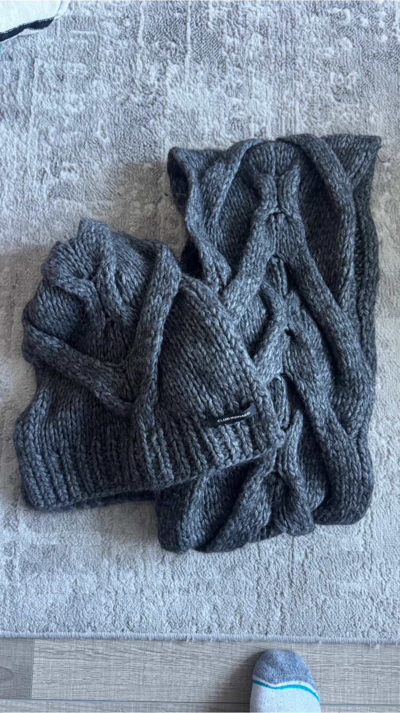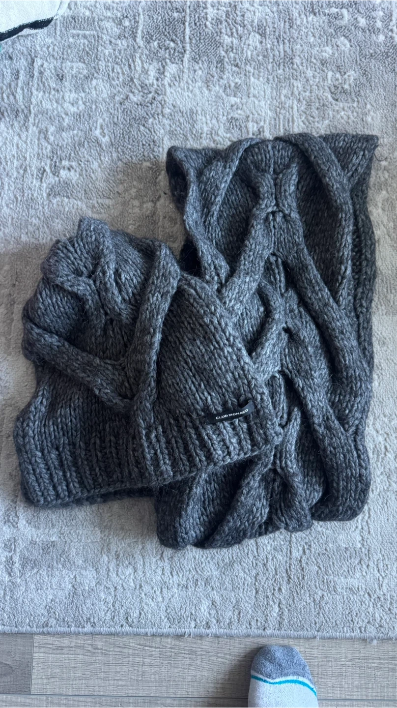 171Cozy up with this Club Monaco knit scarf and hat set! The set is a stylish grey colour and features a chunky knit design. Perfect for staying warm during the cooler months!