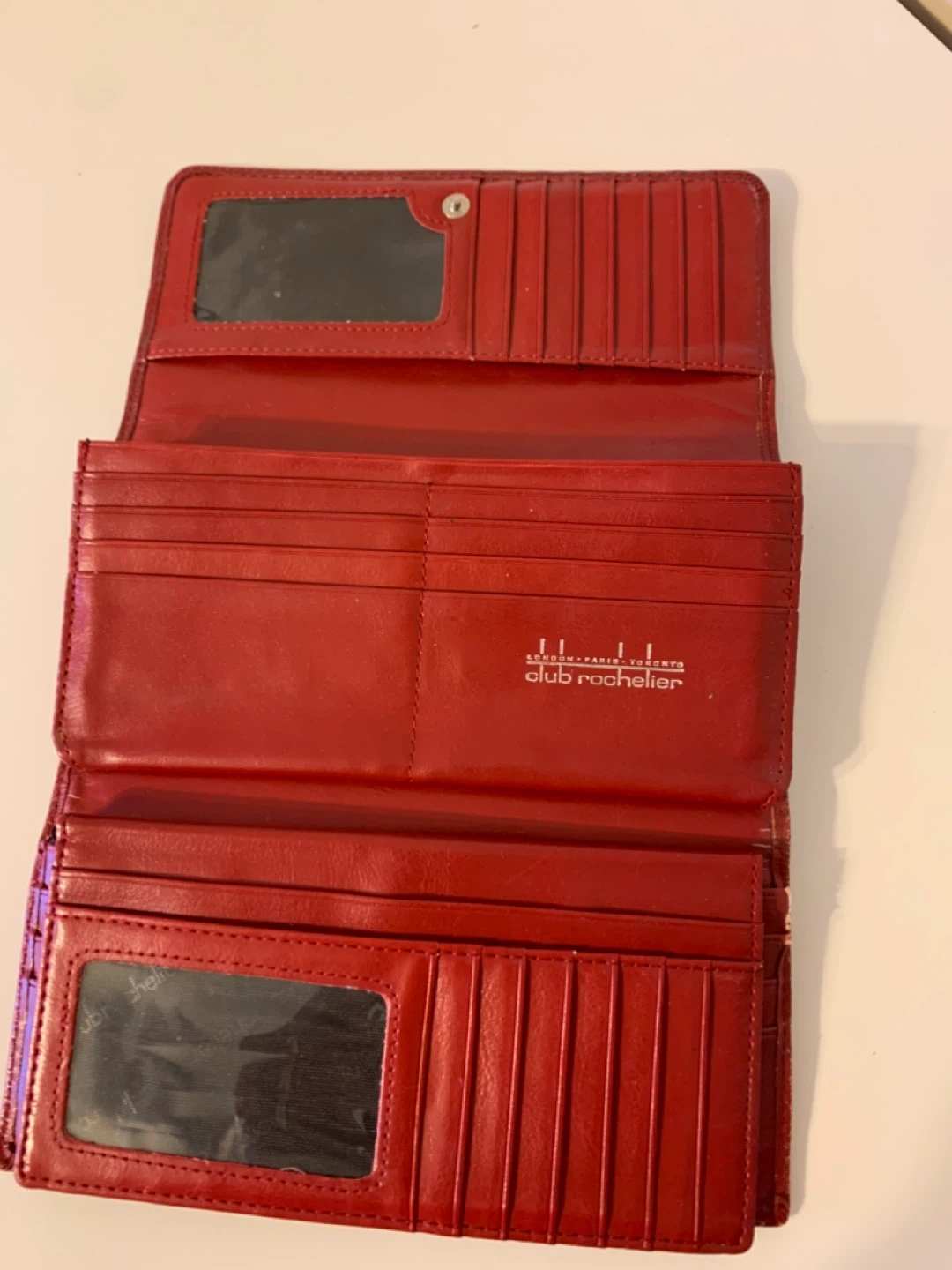 41Selling a Club Rochelier ladies wallet in red leather. It has a zippered compartment on the back and lots of slots inside for cards and cash. It's a stylish and functional accessory!