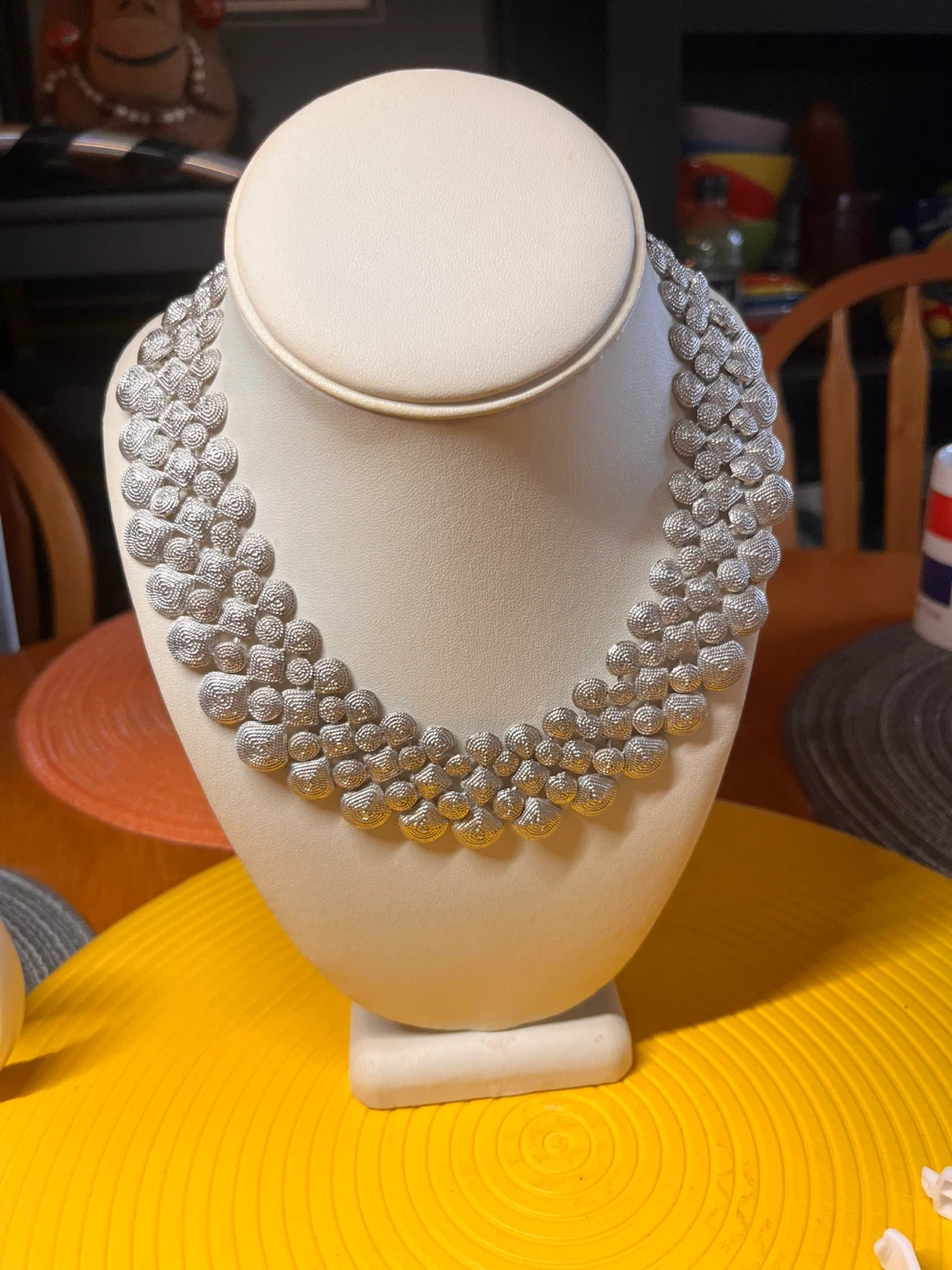A matching necklace and earring set with a textured, silver-tone finish. The necklace features a multi-layered, circular design. This set adds a statement to any outfit.