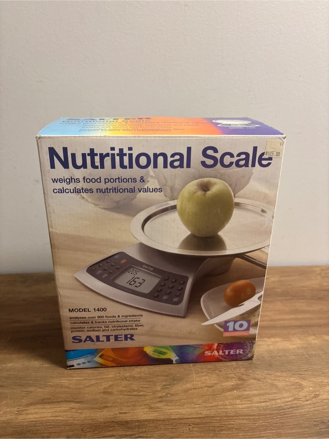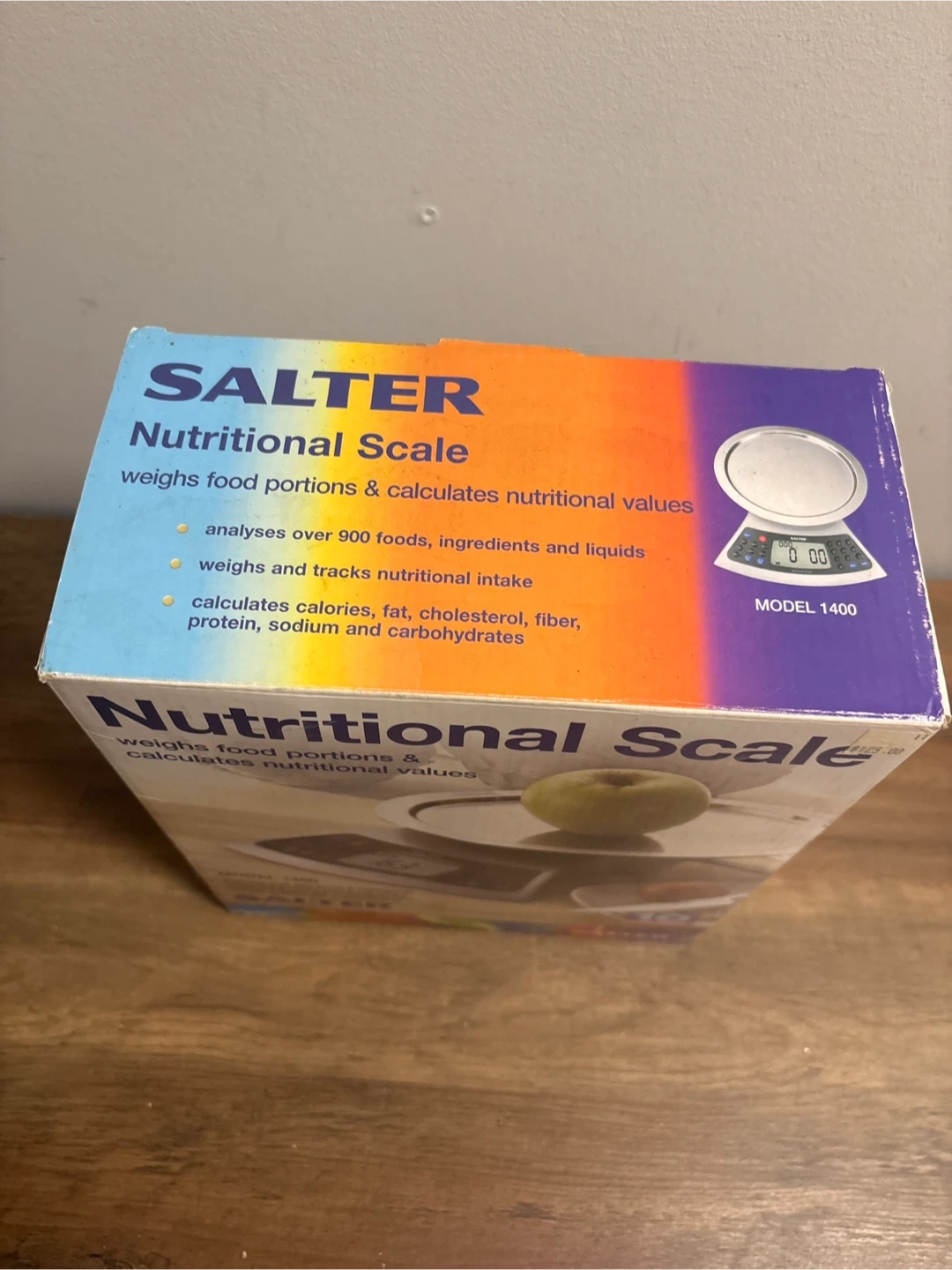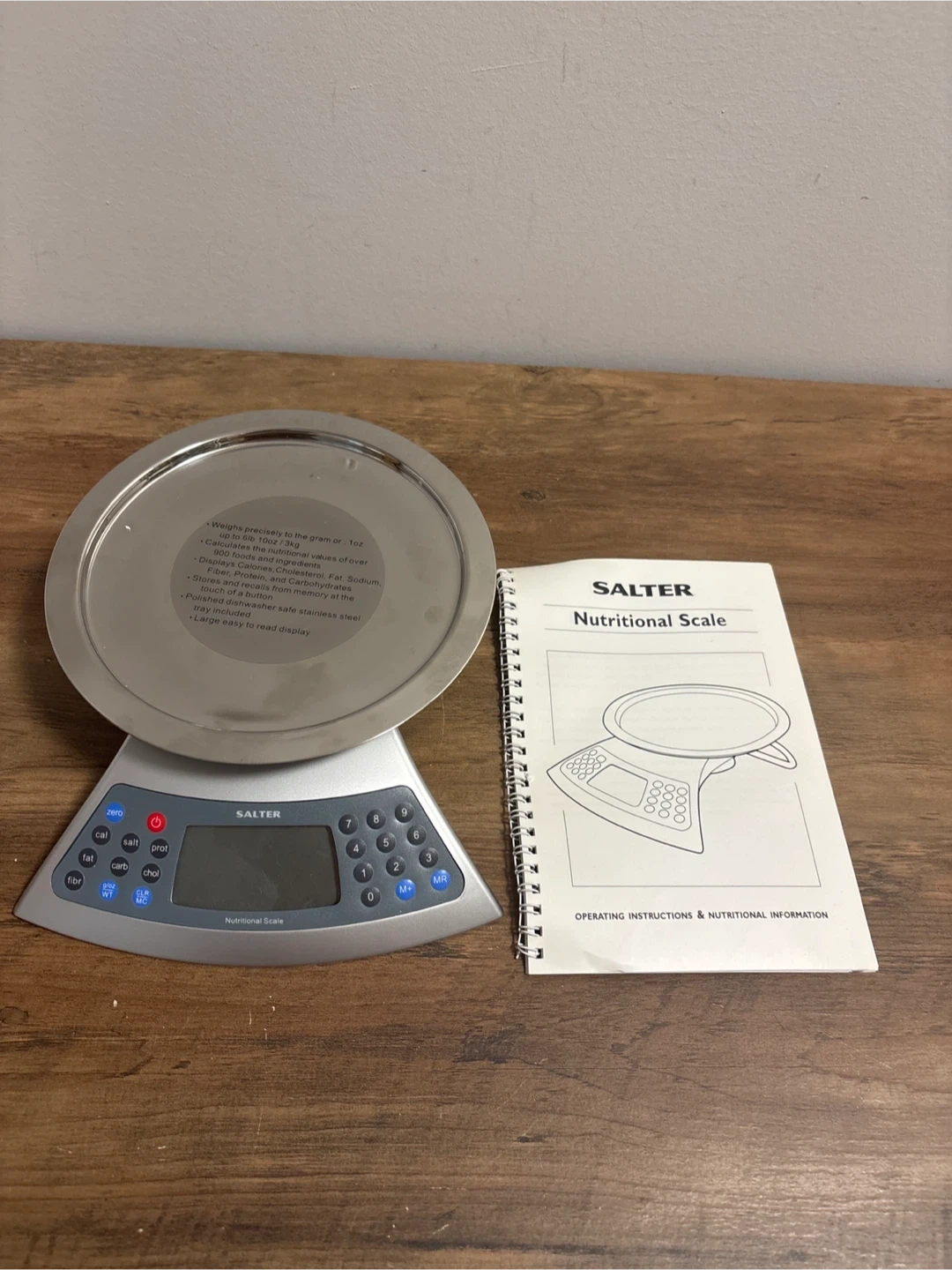 This Salter Nutritional Scale weighs food portions and calculates nutritional values. It analyzes over 900 foods, ingredients, and liquids, displaying calories, fat, cholesterol, fiber, protein, sodium, and carbohydrates. The scale has a polished, dishwasher-safe stainless steel tray and an easy-to-read display.