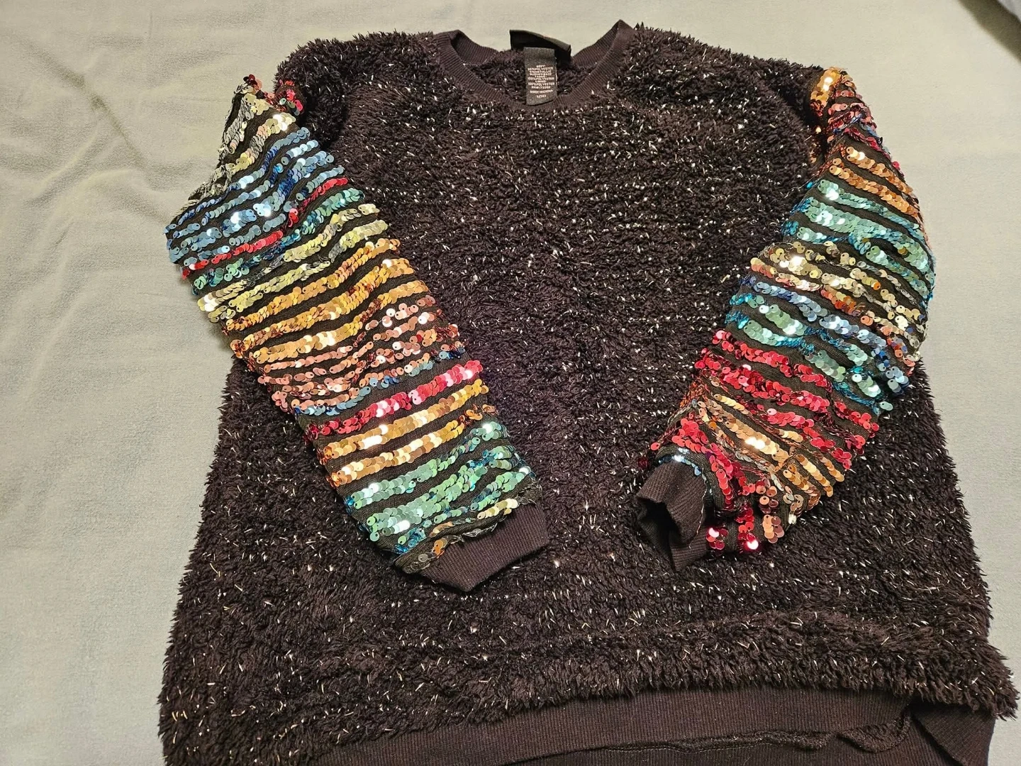 Selling a cute black sweater with sequin sleeves! It's in great condition and ready for a new owner. The sleeves have colourful sequins that add a fun pop to any outfit