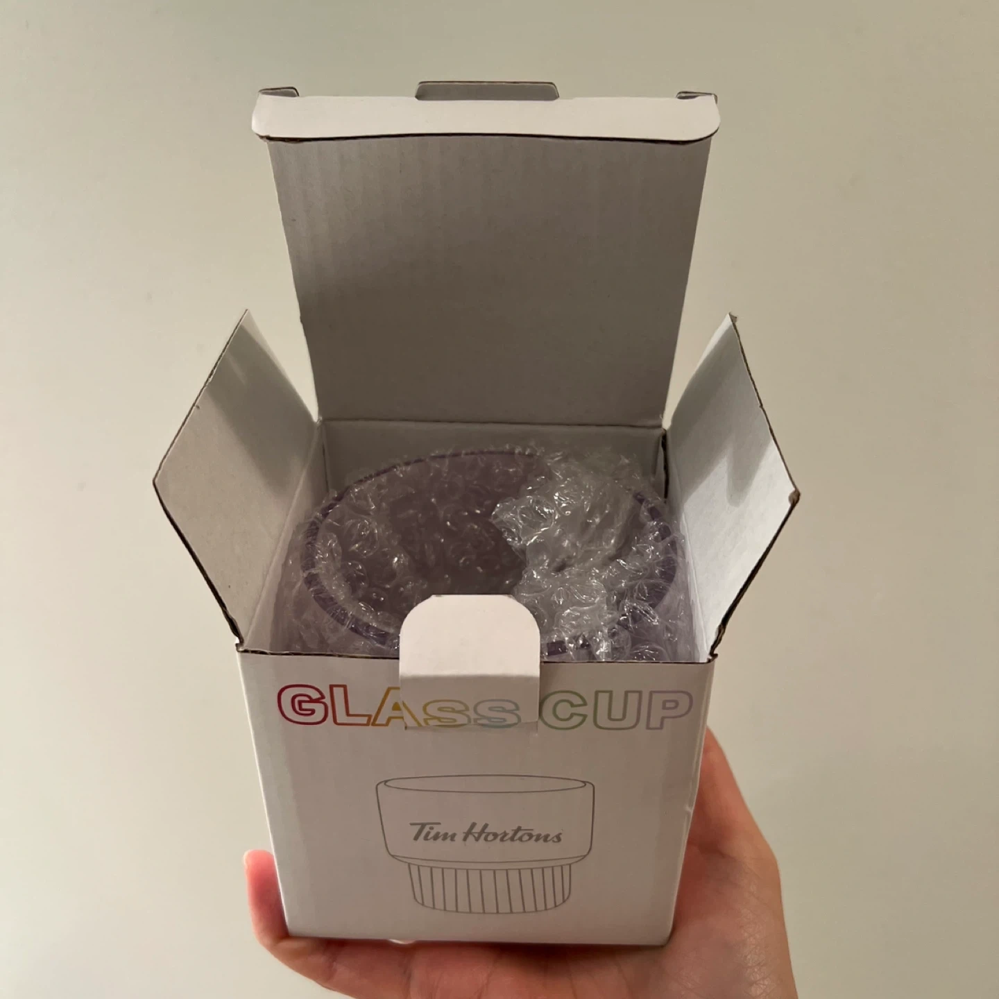 Limited Edition Tim Hortons branded glass cup. It's made of clear glass with a purple tint at the top. Comes with its original box. A nice collectible for any Tim Hortons fan!