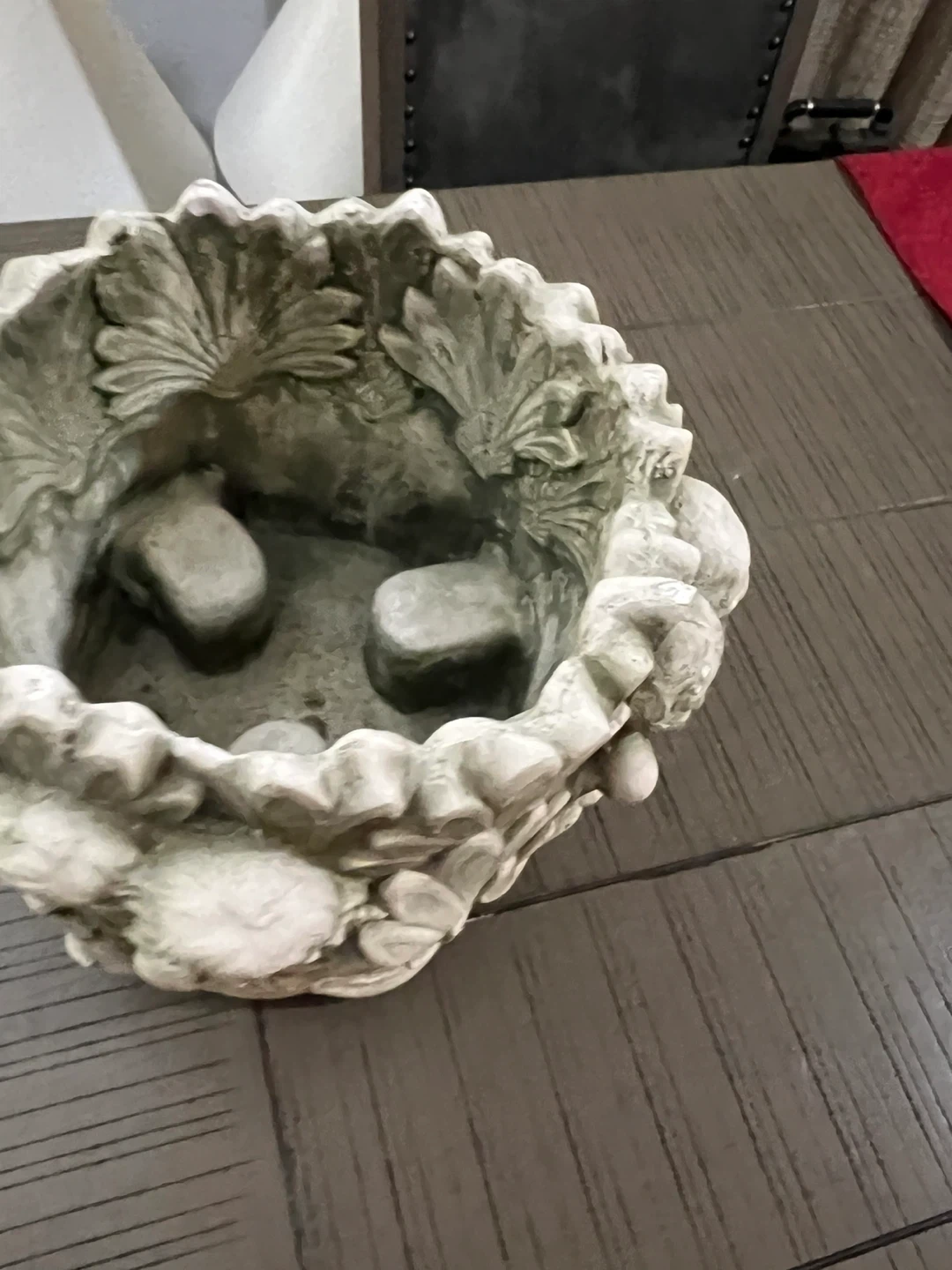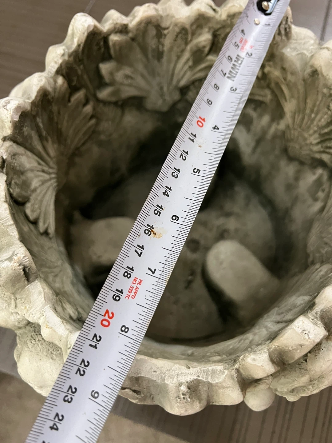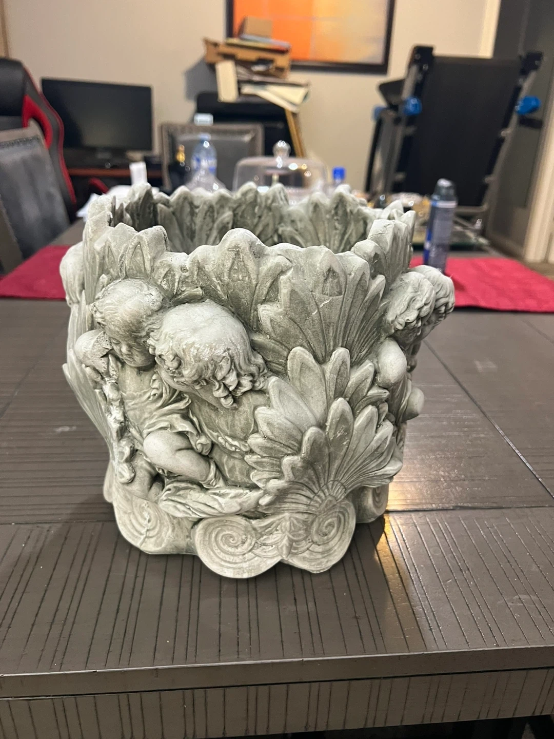This decorative planter pot features an intricate cherub angel design. It's made from a durable stone-like material, perfect for outdoor use. This pot would look great on a patio or in a garden!