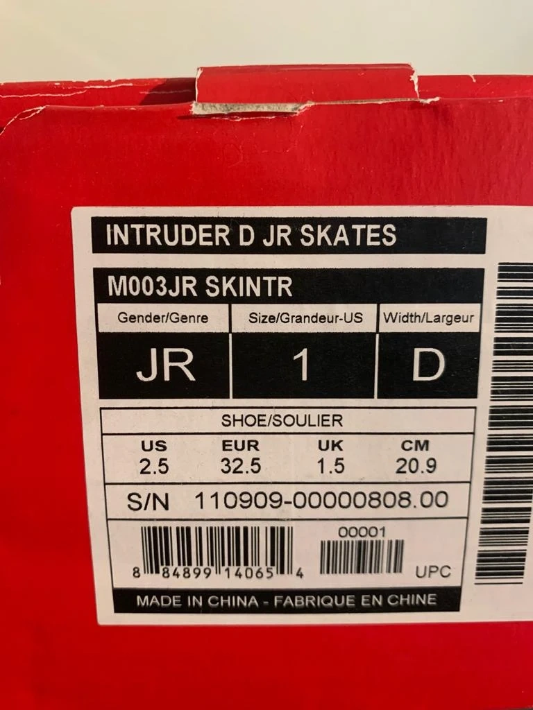These CCM Intruder D JR skates are in youth size 1. They are black with red and white accents. The skates come in their original box. Used only once.