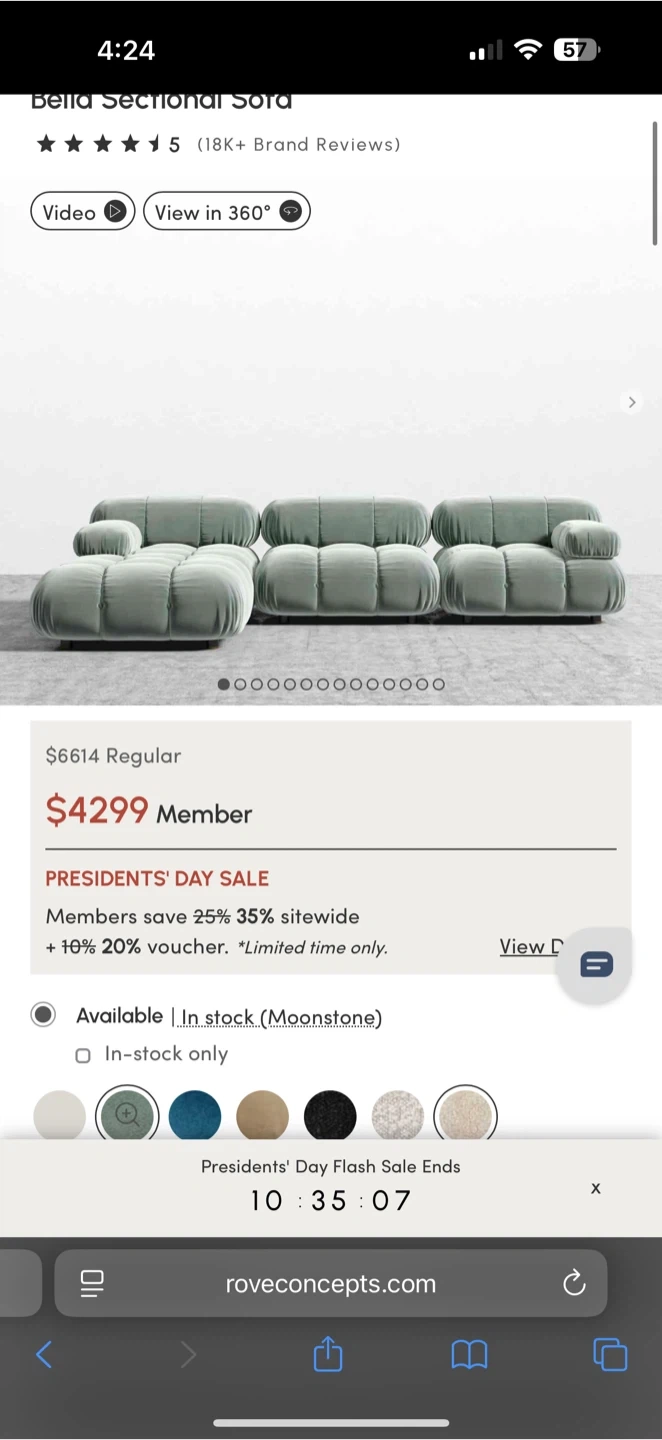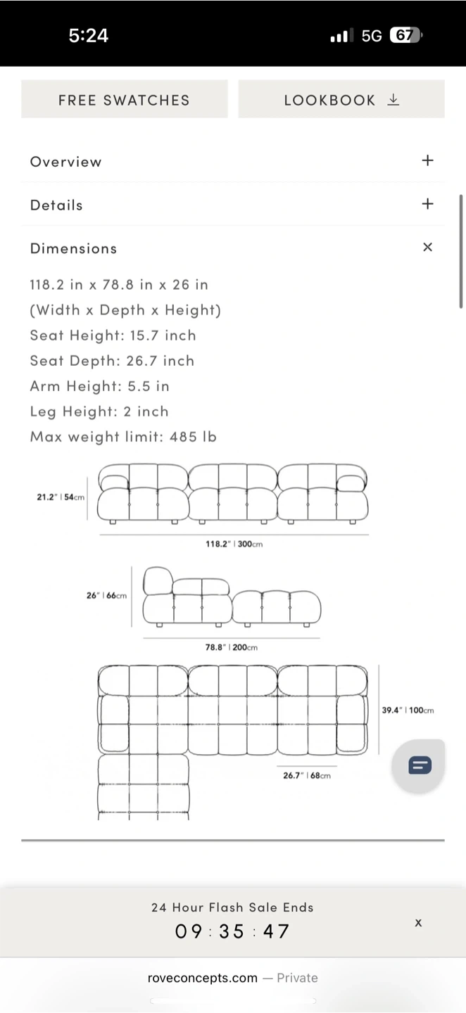 Rove Concepts Bella Sectional Sofa in Moonstone. This sofa measures 118.2" wide, 78.8" deep, and 26" high. Seat height is 15.7" and seat depth is 26.7". It's a stylish and comfortable addition to any living space.