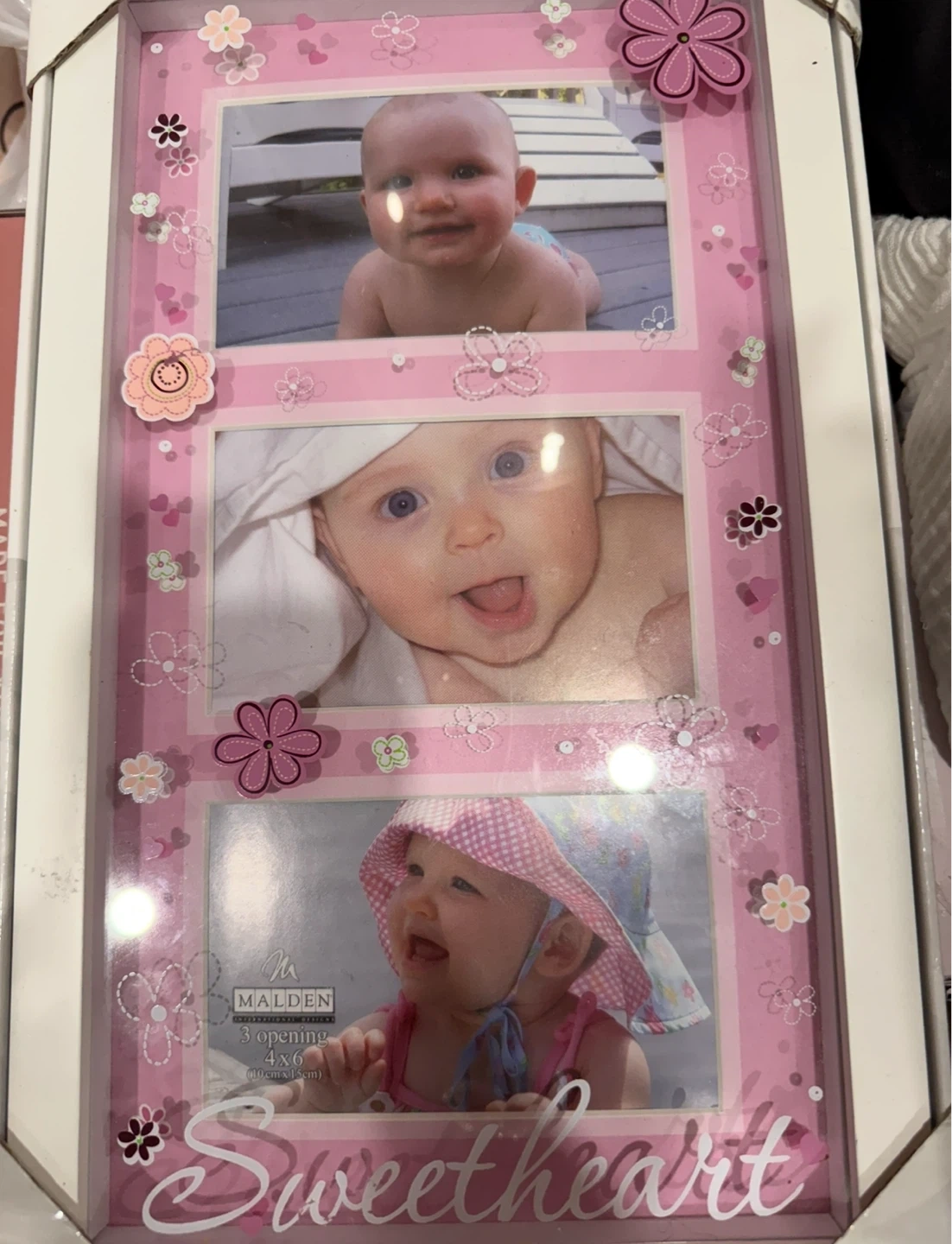 A pink Malden photo frame with 'Sweetheart' text. It has three openings for 4x6 photos. Frame is decorated with floral accents. Perfect for displaying baby pictures!