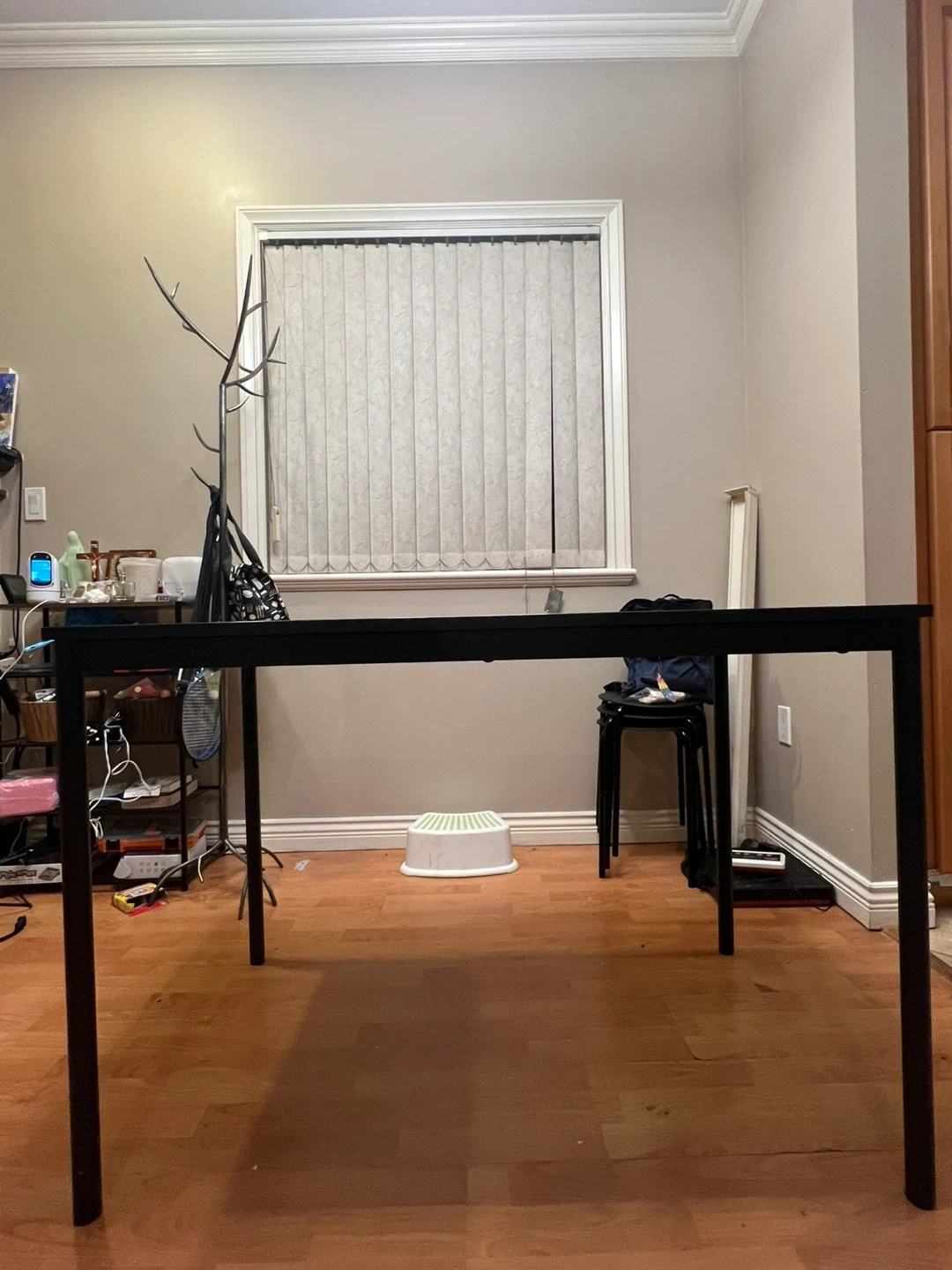 Simple black metal dining table. It has a sleek, minimalist design perfect for any kitchen or dining area. Can seat four people comfortably.