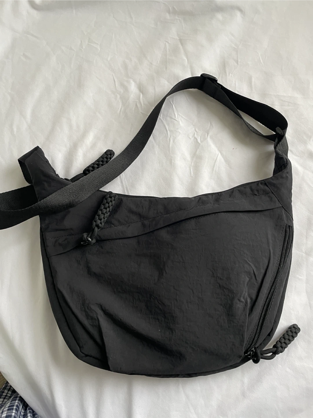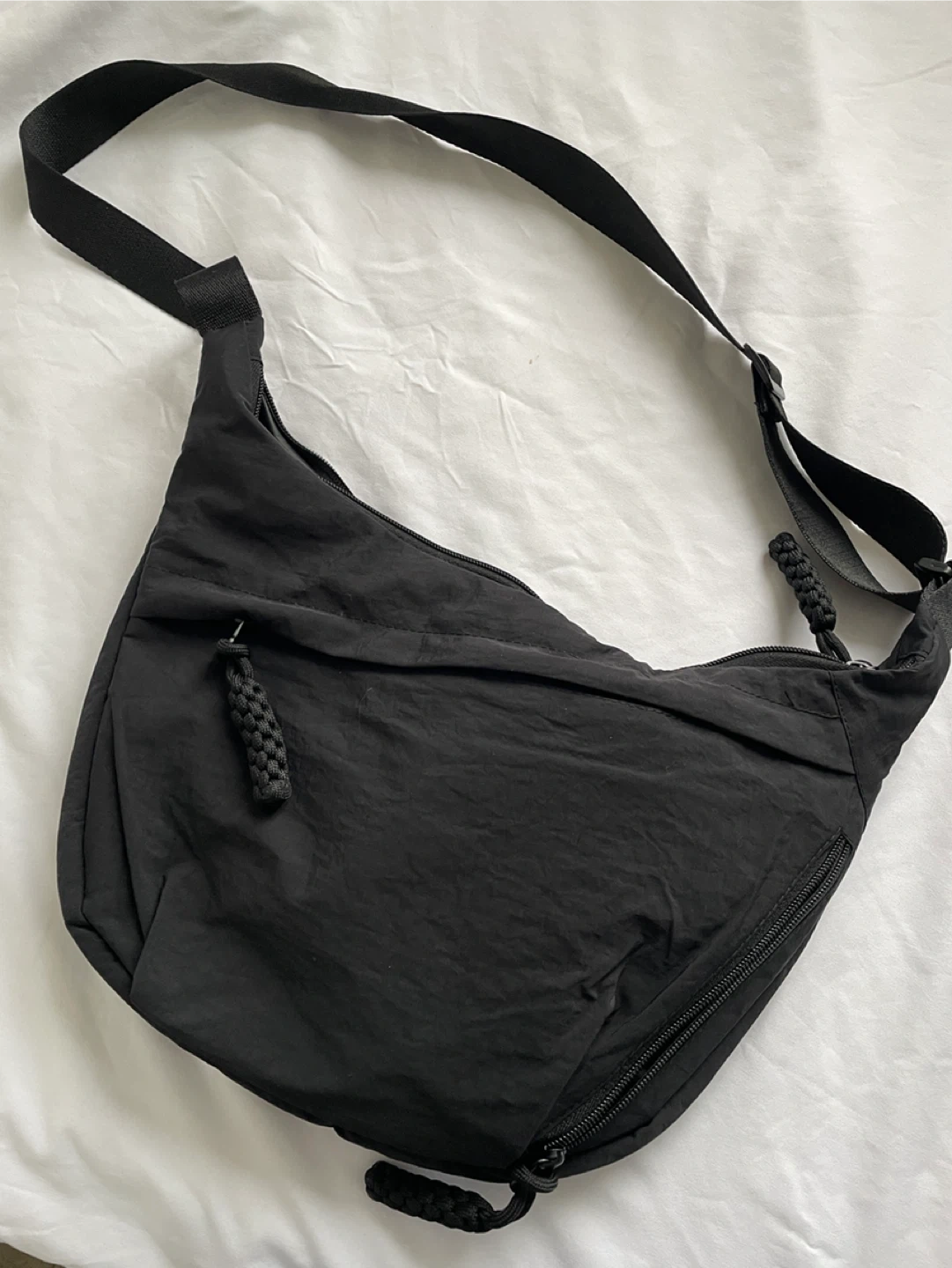 A black crossbody shoulder bag with a nylon-like material. It features multiple zippered compartments and braided zipper pulls. The strap is adjustable.