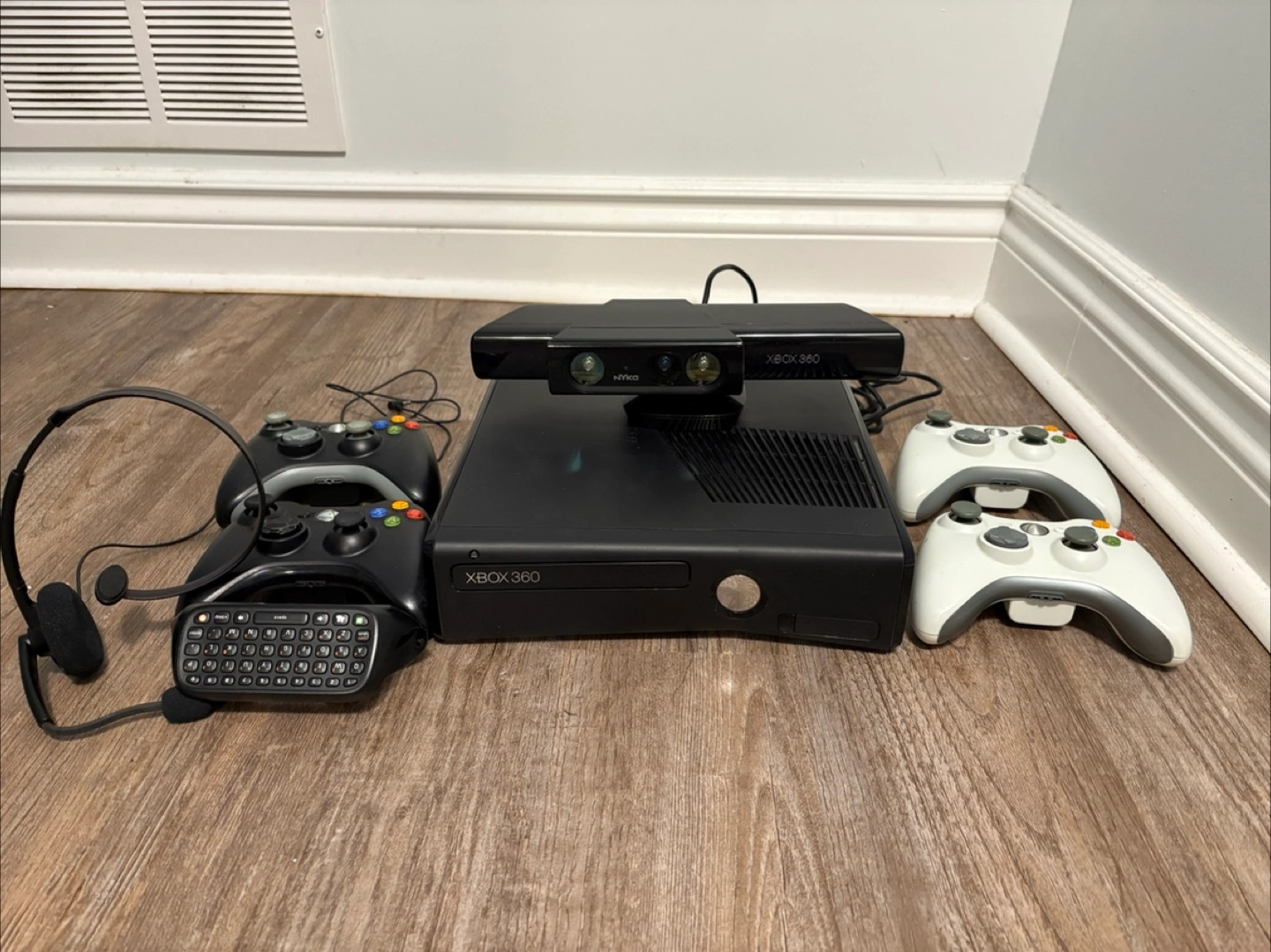 Selling an Xbox 360 S console with Kinect. Comes with 4 controllers, a chat pad, and a headset, all tested and in working order. It comes with a few games as well. Perfect for some family fun or reliving some classic gaming moments!