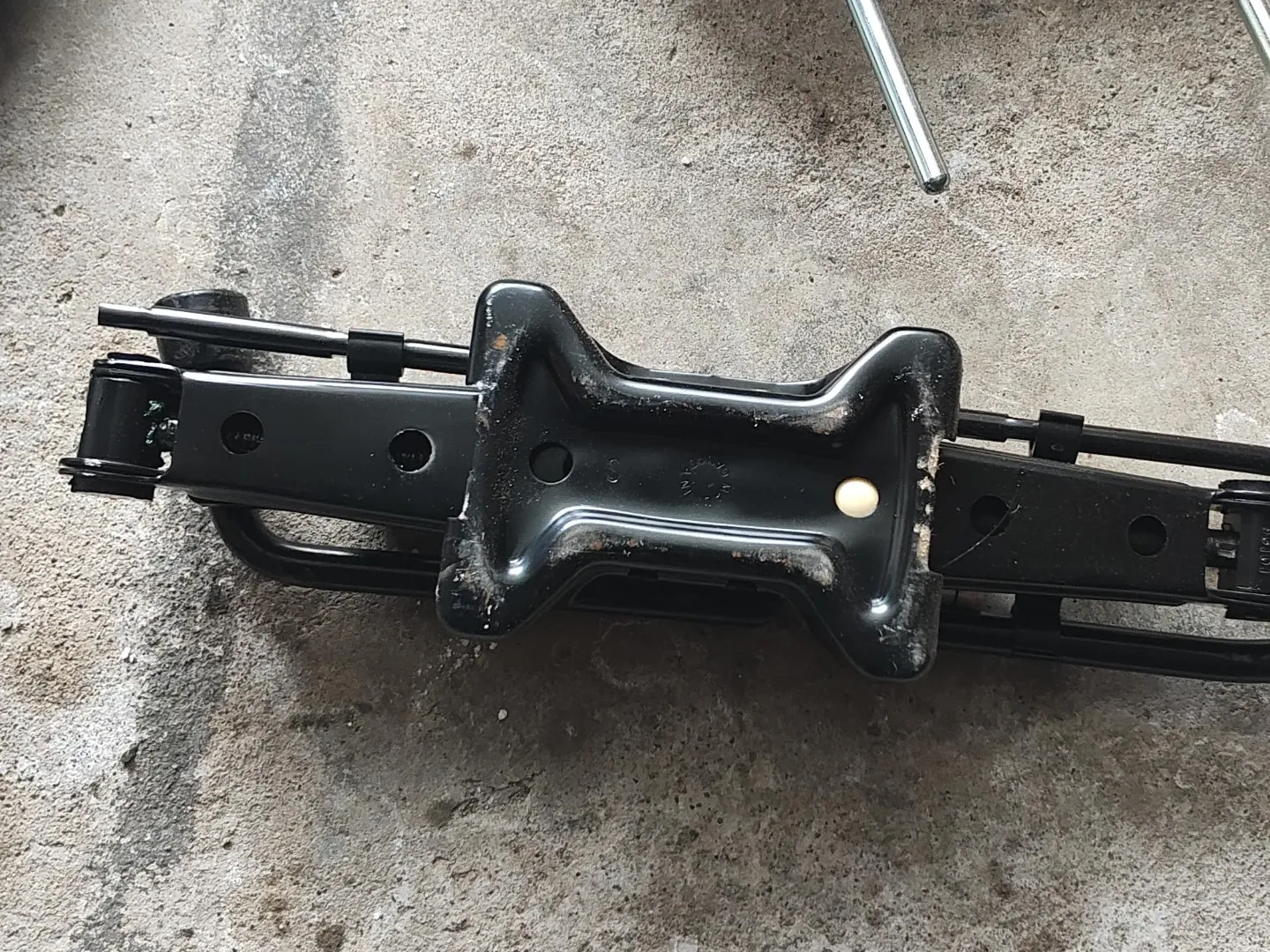 This is a black scissor jack with a crank handle. It's made of metal and appears to be for automotive use. A metal rod is included for operation.