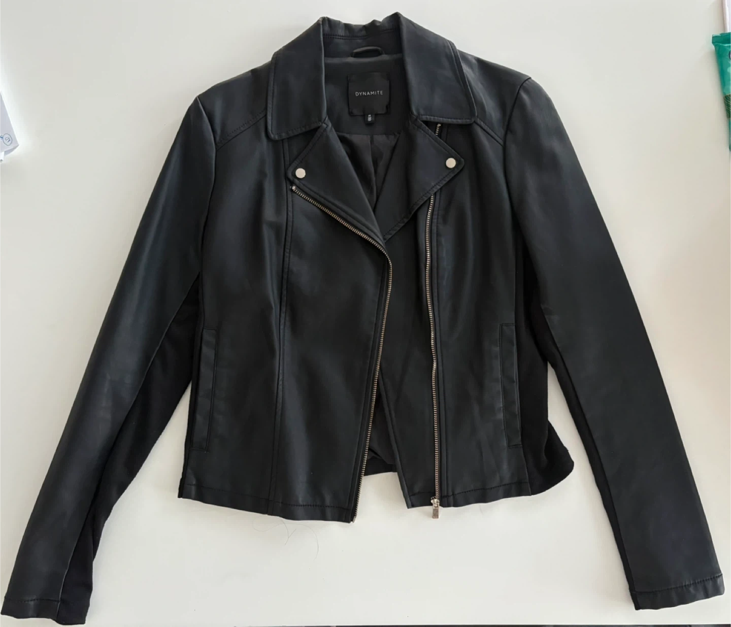 It's a size medium, fits like a small. The jacket features a zip-up front and a satin-like lining. Worn only twice. It’s in great condition. Great for Fall!