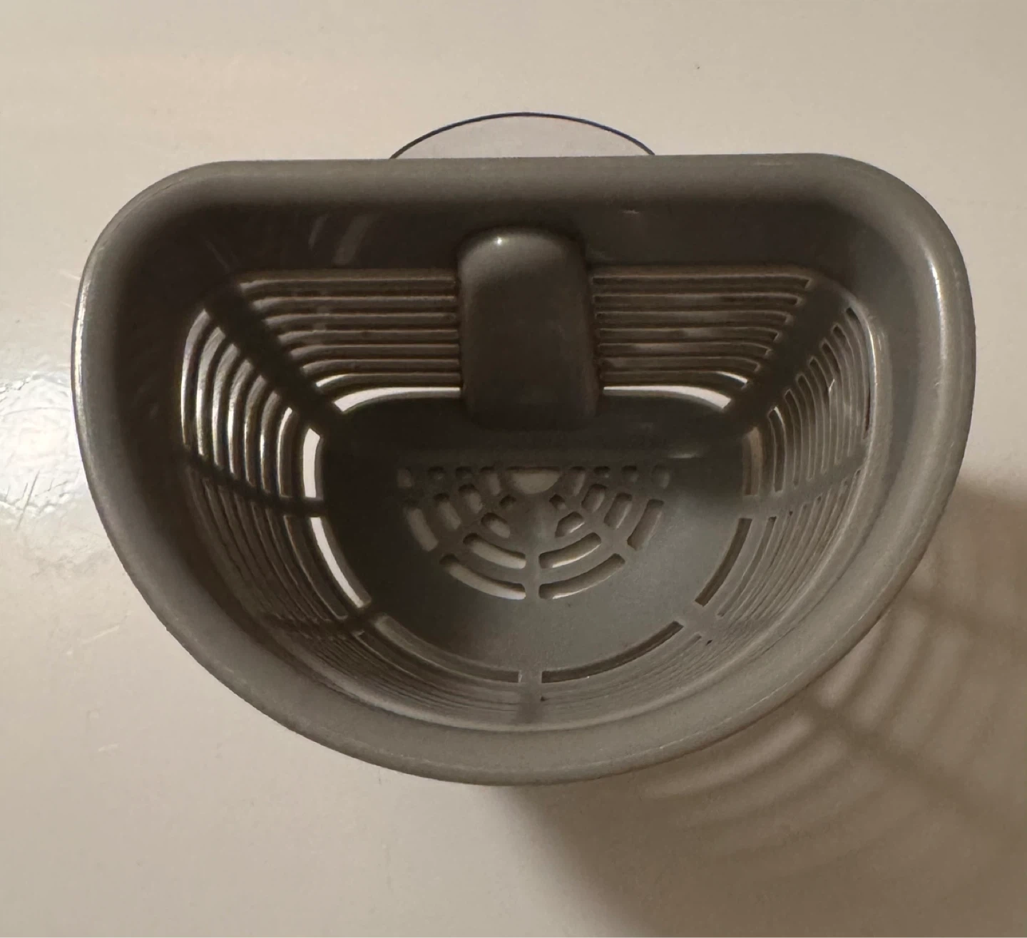 Grey plastic shower caddy with suction cup