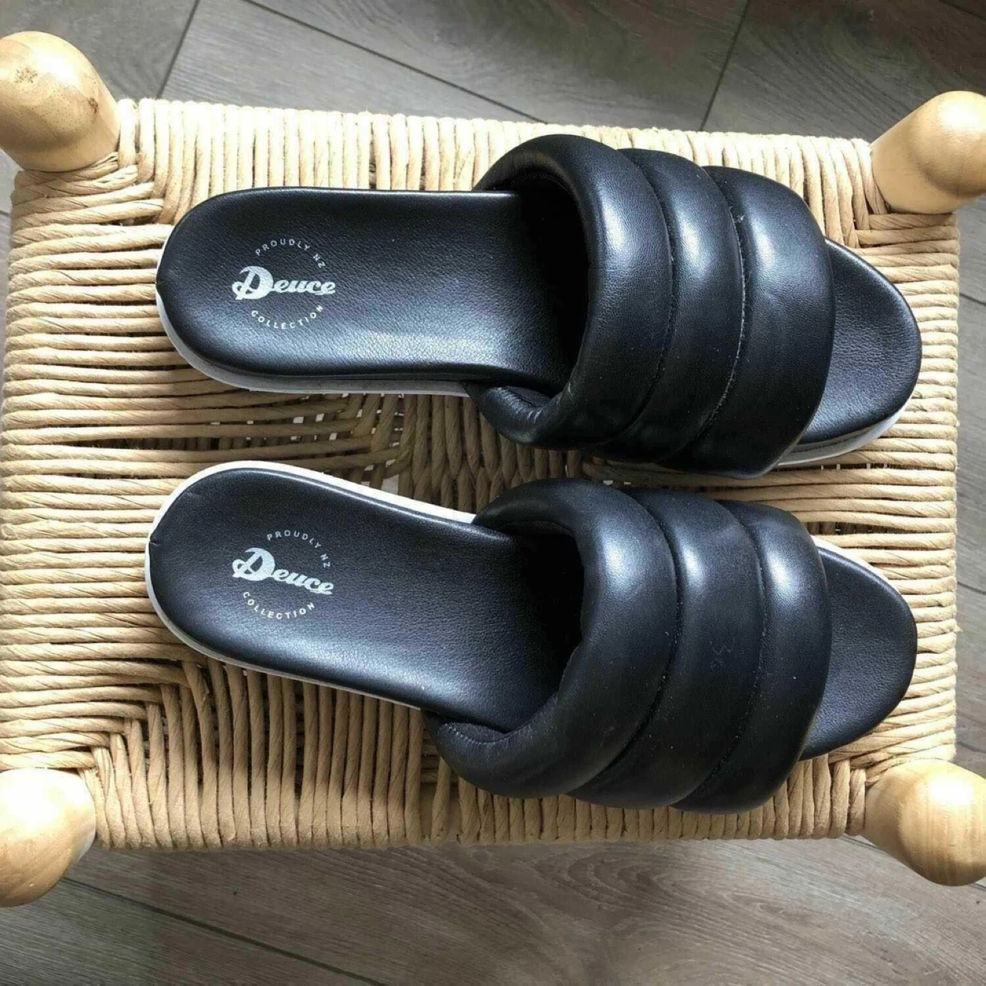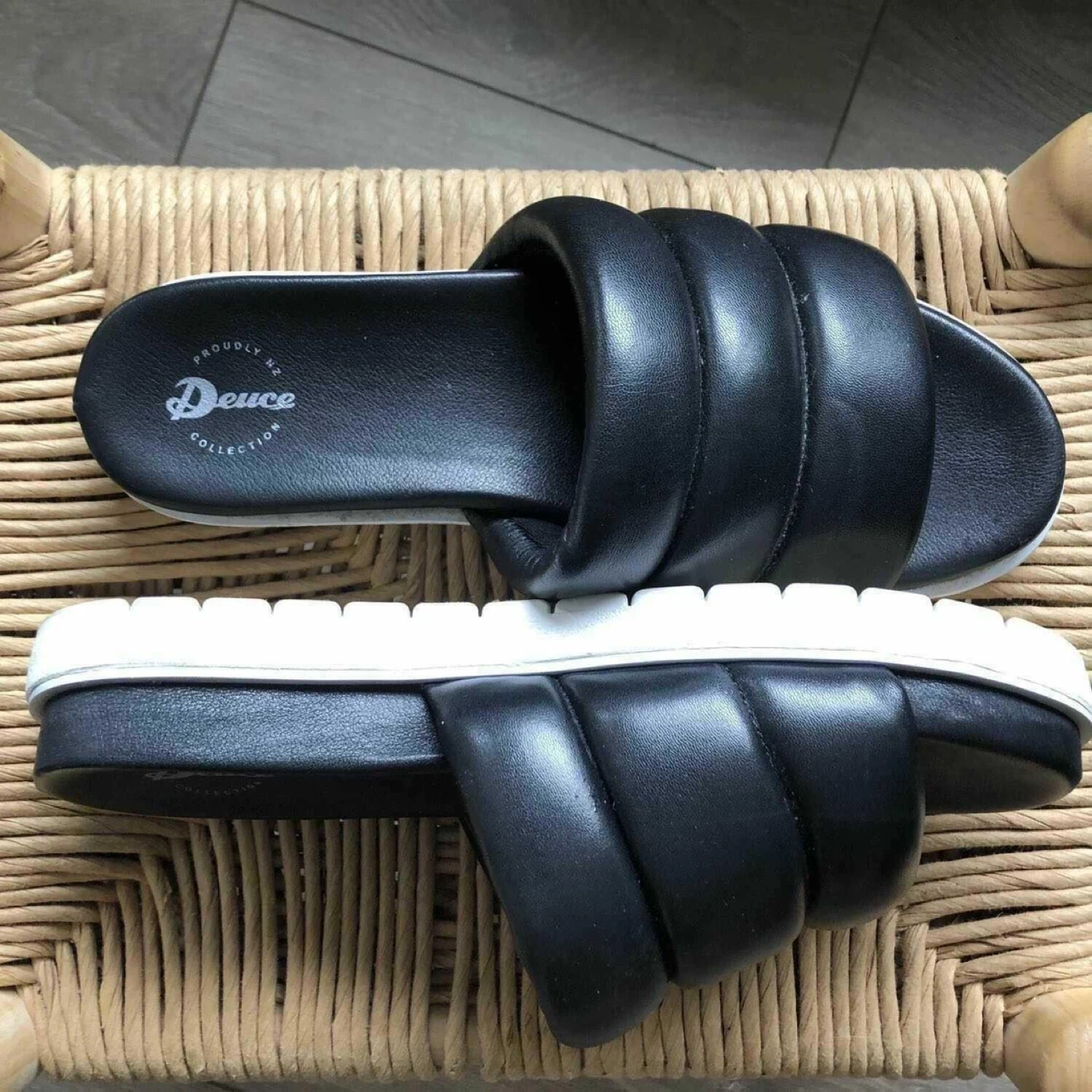 These Deuce Jarvis slides are black with a puffy strap design. They feature a comfortable footbed and a white sole. Perfect for any occasion !