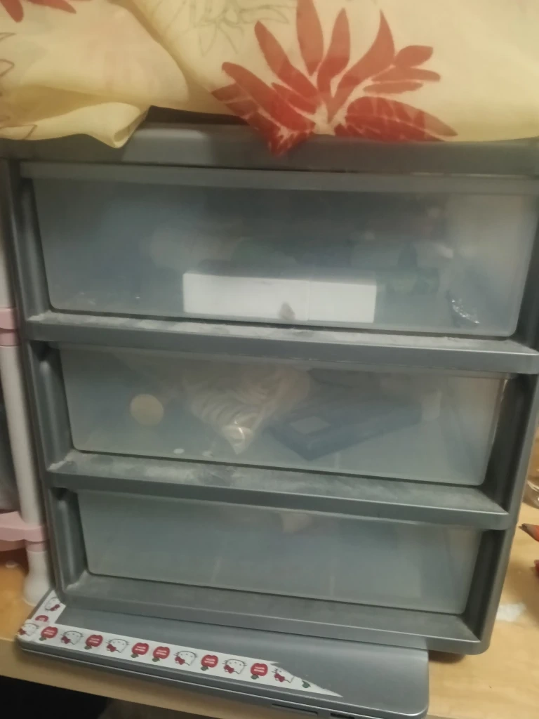 Selling a grey plastic storage drawer unit. It features three drawers, perfect for organizing various items around your home. It shows some signs of use, but is still fully functional.
