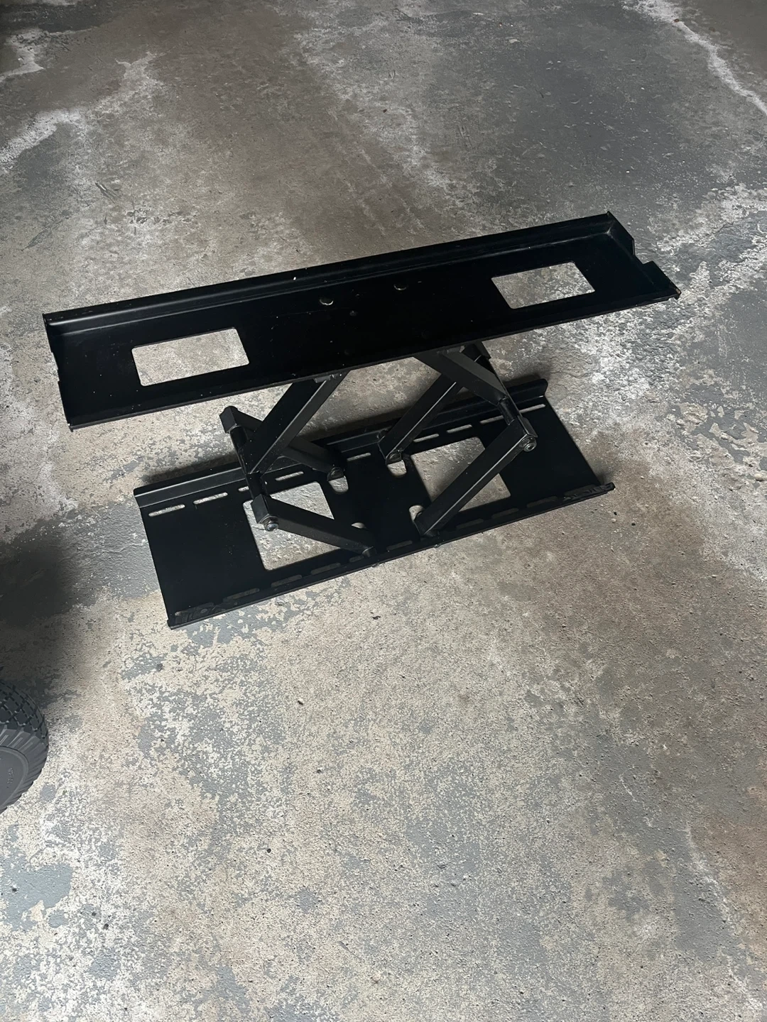 This black articulating TV wall mount bracket offers flexible viewing angles. It's made of sturdy metal construction. This mount is suitable for various TV sizes and is designed for secure wall installation.