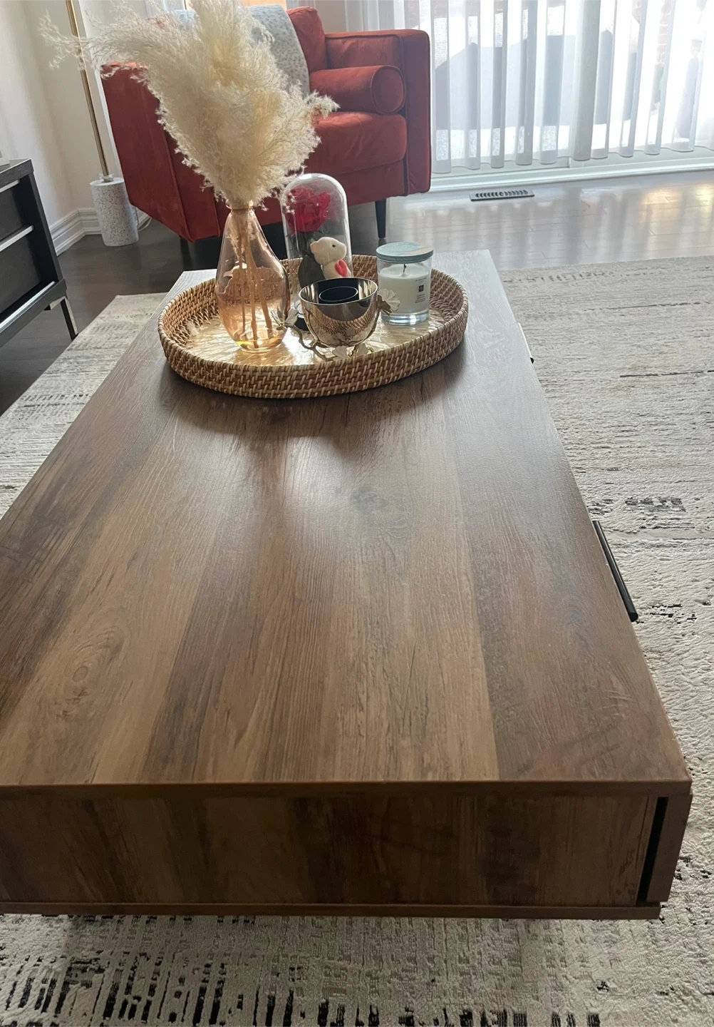 Structube Rectangular coffee table with decorative drawer fronts. It has two drawers with black handles for storage. Metal legs provide a sturdy base.