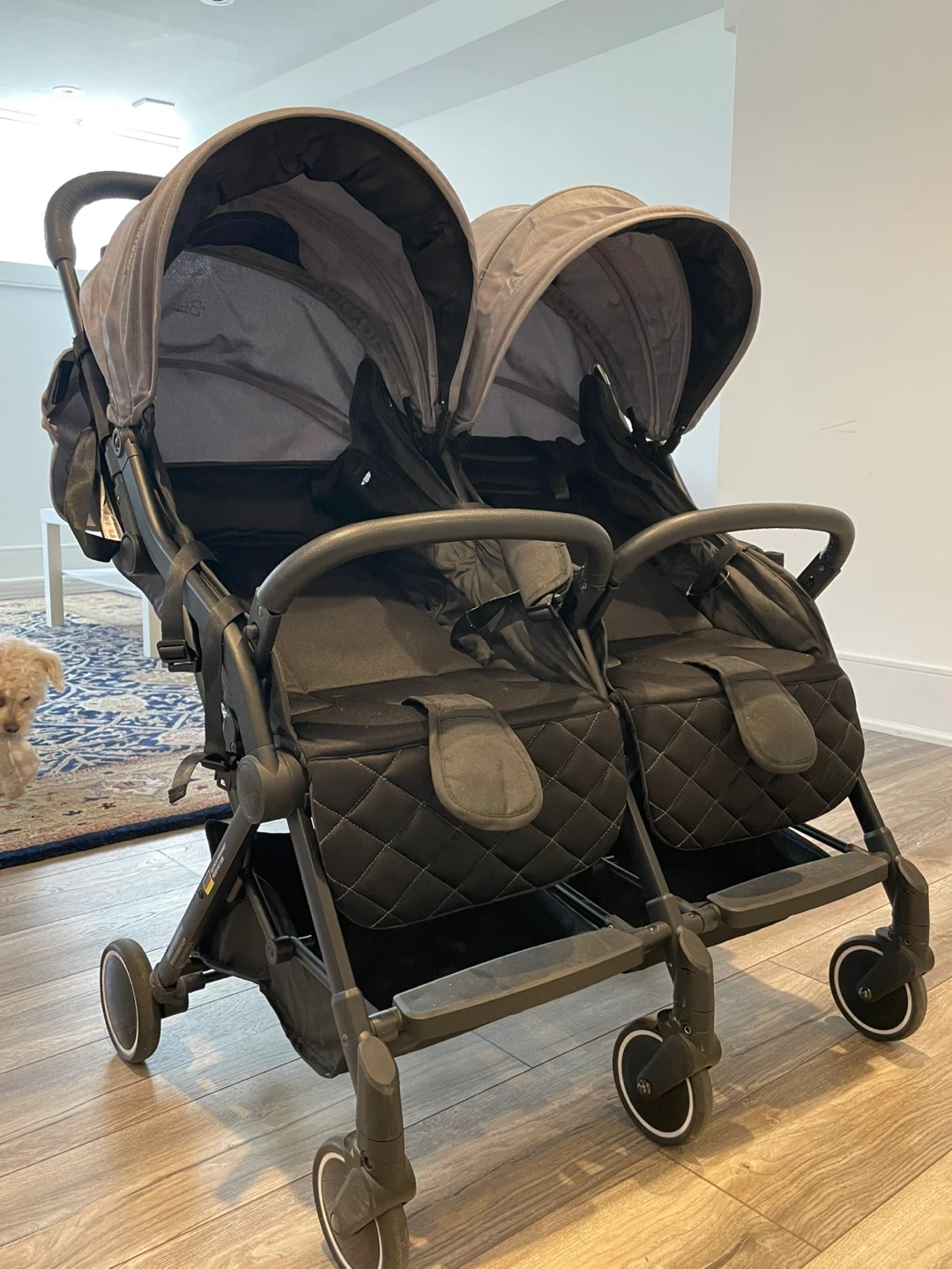 This is a Bugaboo Donkey twin stroller, perfect for parents with two little ones. It's a versatile double stroller that can be configured in multiple ways. It has a sturdy frame and comfortable seats for both children.