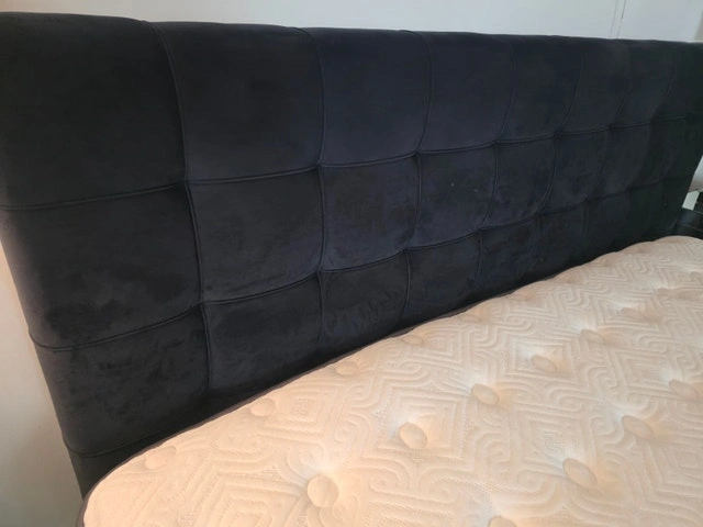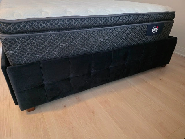 Black velvet upholstered platform bed with a tufted headboard. Features 4 storage drawers underneath. Includes a Serta mattress in like-new condition. Used - Good. For Sale By: Owner.