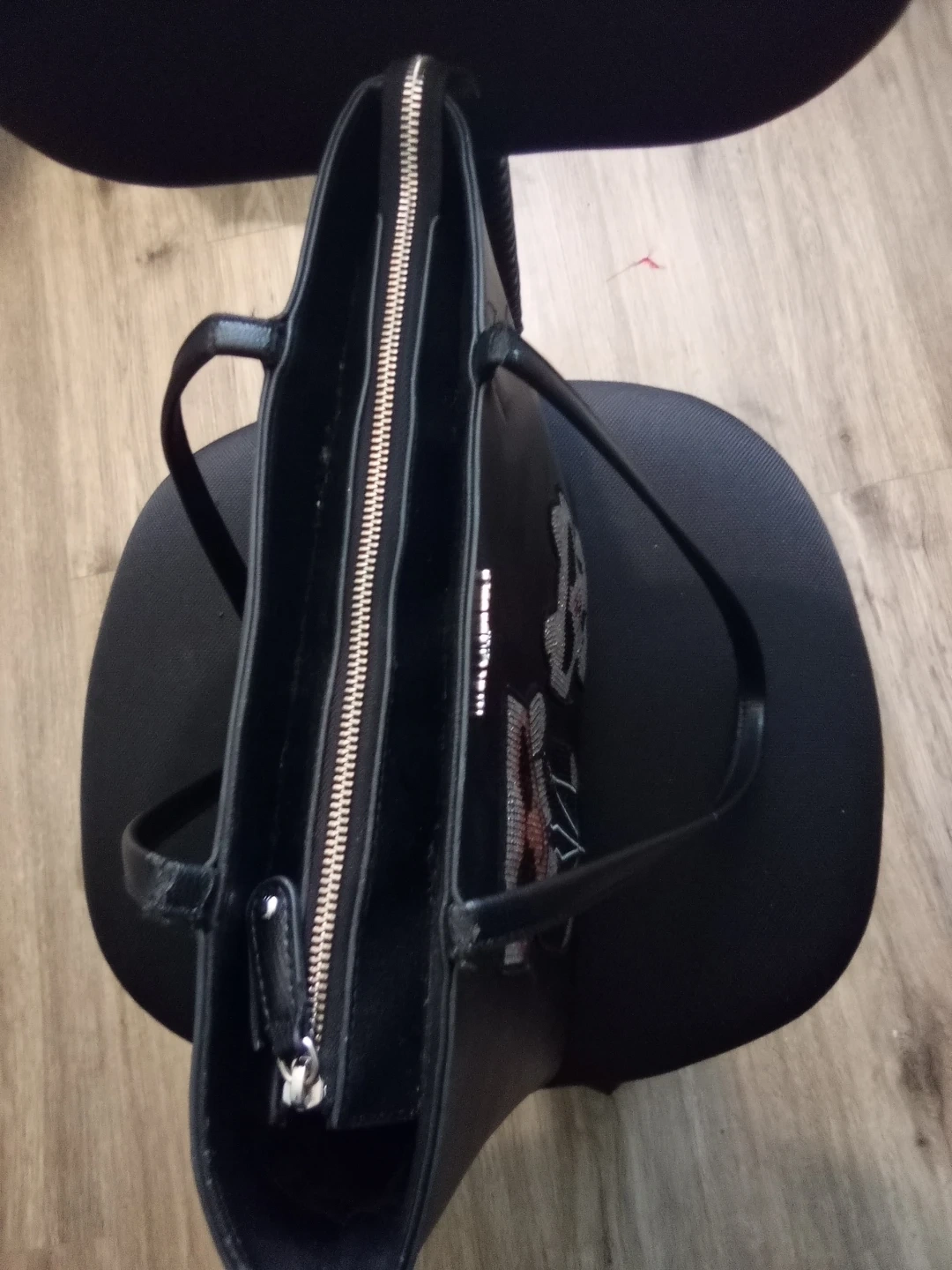 Selling a Karl Lagerfeld black tote bag. It features a fun design with Karl and his cat, Choupette, in sparkling embellishments. It's in great shape and ready for a new owner!