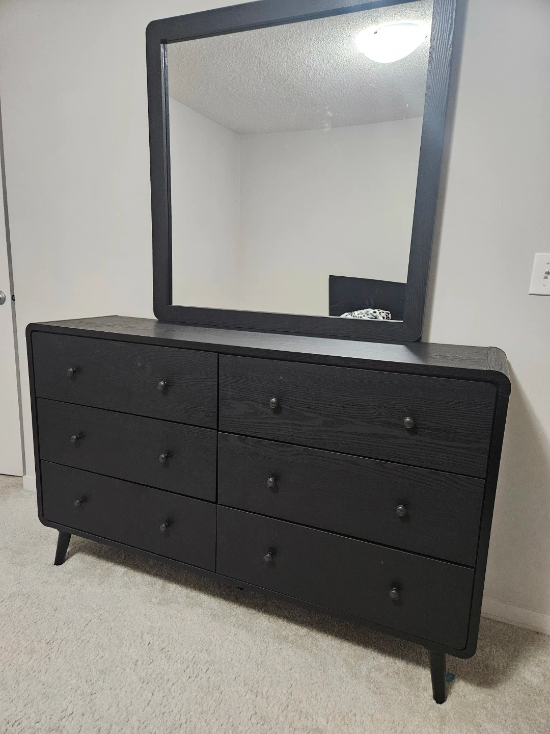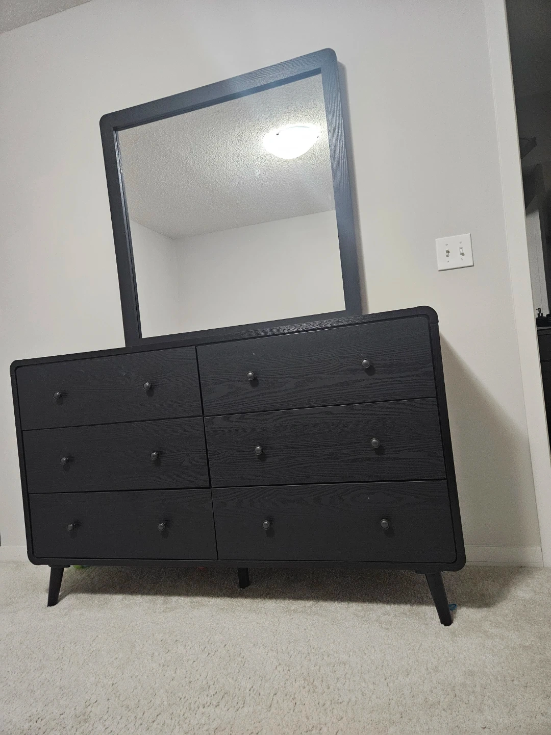 This black dresser comes with six drawers for plenty of storage. It has a modern design with tapered legs and includes a matching mirror. The finish is a dark wood grain.