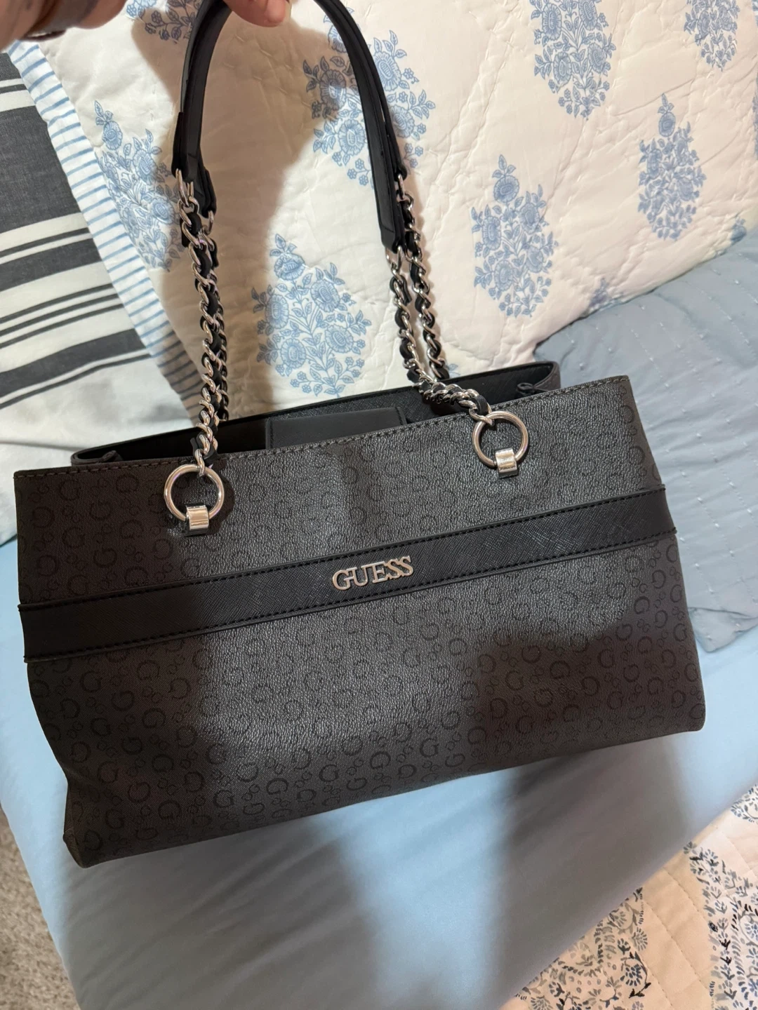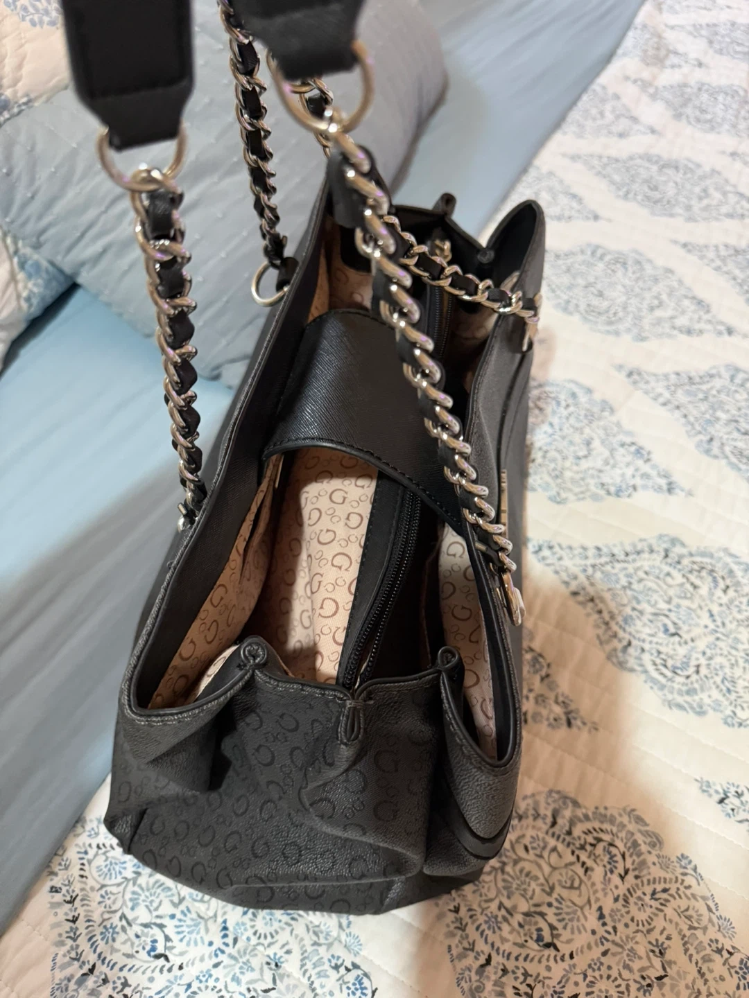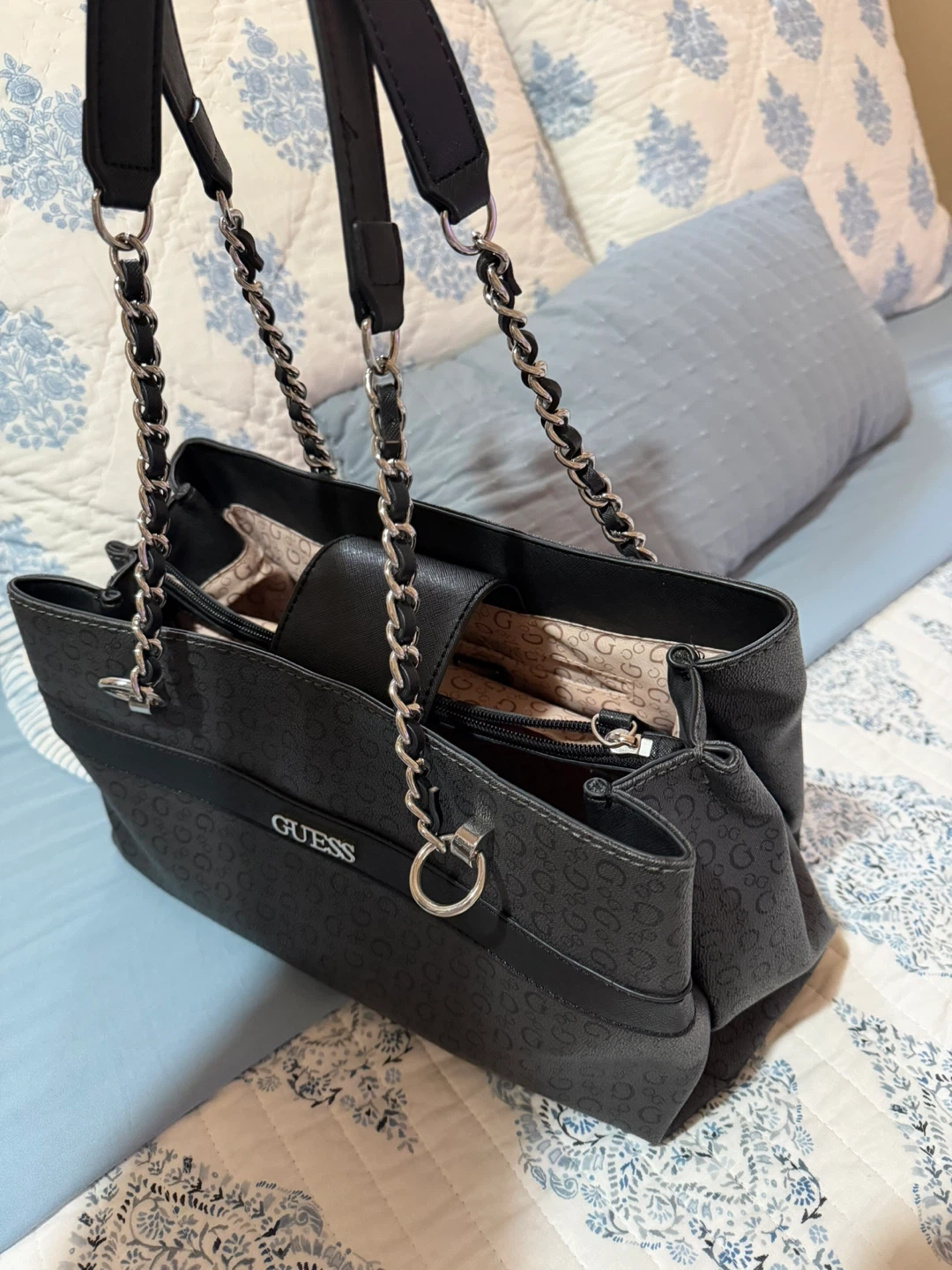 Buy & SellBlack Guess Tote BagBlack Guess Tote Bag$60This is a black Guess tote bag. It has a chain strap detail. The interior has multiple compartments.ConditionLike newBrandGuessWHERE TO MEET14237 23 stView MapSELLERElviaKirkness301 review0 chats·1 favorites·11 viewsSEND CHAT TO SELLERHi Elvia! I’m interested in your listing.Hi Elvia! I’m interested in your listing.Get the Karrot app to chatSign In to chat