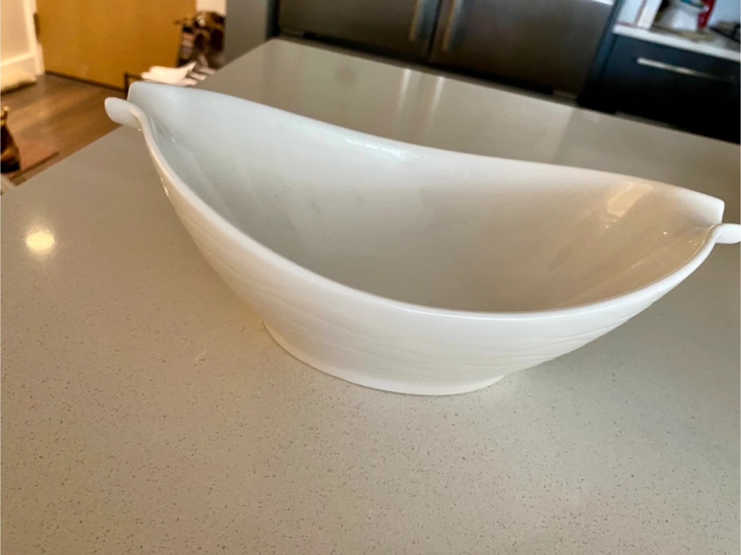 🥕Vintage , White ceramic serving bowl with a subtle wavy texture on the exterior. It has two side slots on each end. This bowl is great for serving salads or as a decorative centerpiece.