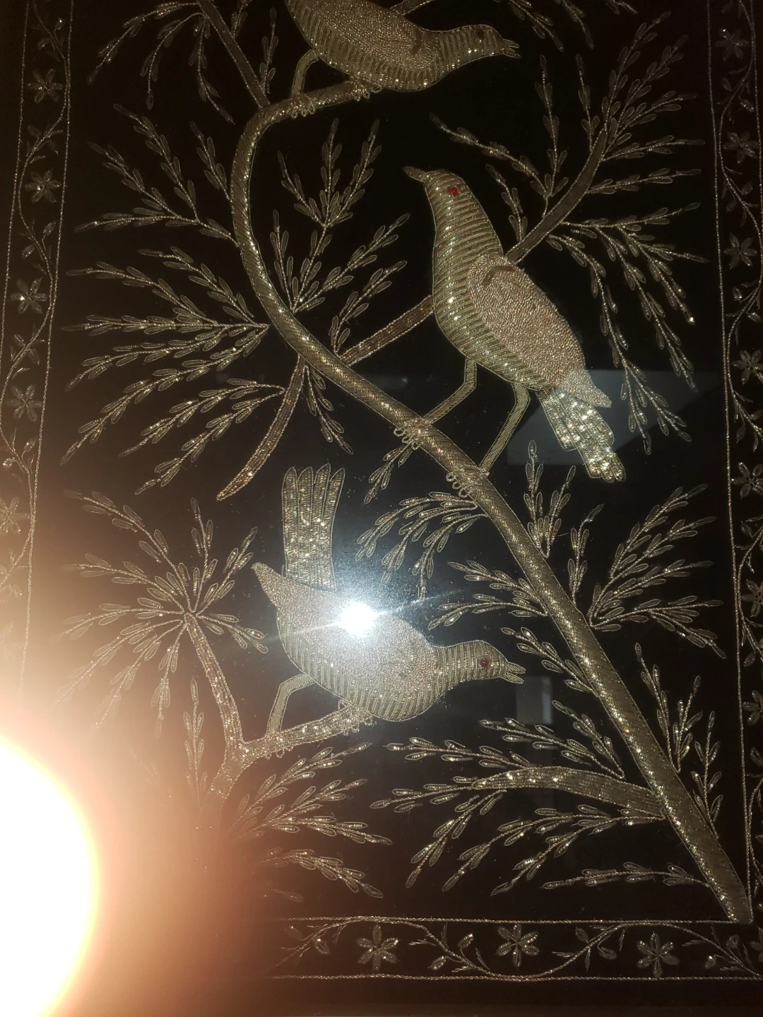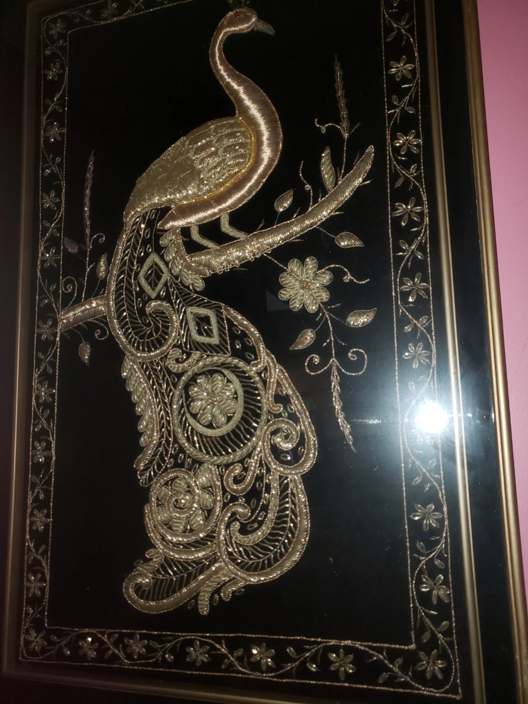 This is a glass framed piece of beaded artwork featuring birds on a branch and a peacock design. The intricate beadwork catches the light beautifully. It's a lovely decorative item for any room.