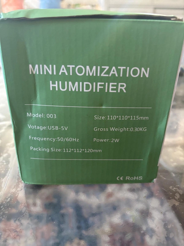 Refresh your space with this mini atomization humidifier! It's in new condition, ready to bring soothing moisture to your home or office. Specifications: Model: 003 Voltage: USB-5V Frequency: 50/60Hz Power: 2W Size: 110*110*115mm Gross Weight: 0.30KG Packing Size: 112*112*120mm I'm pricing this at $20. Let me know if you're interested!