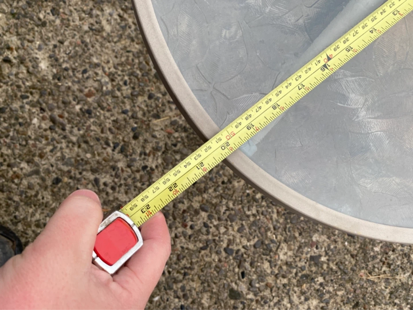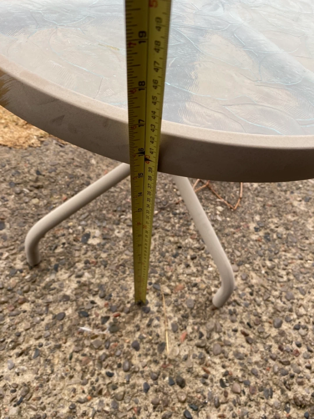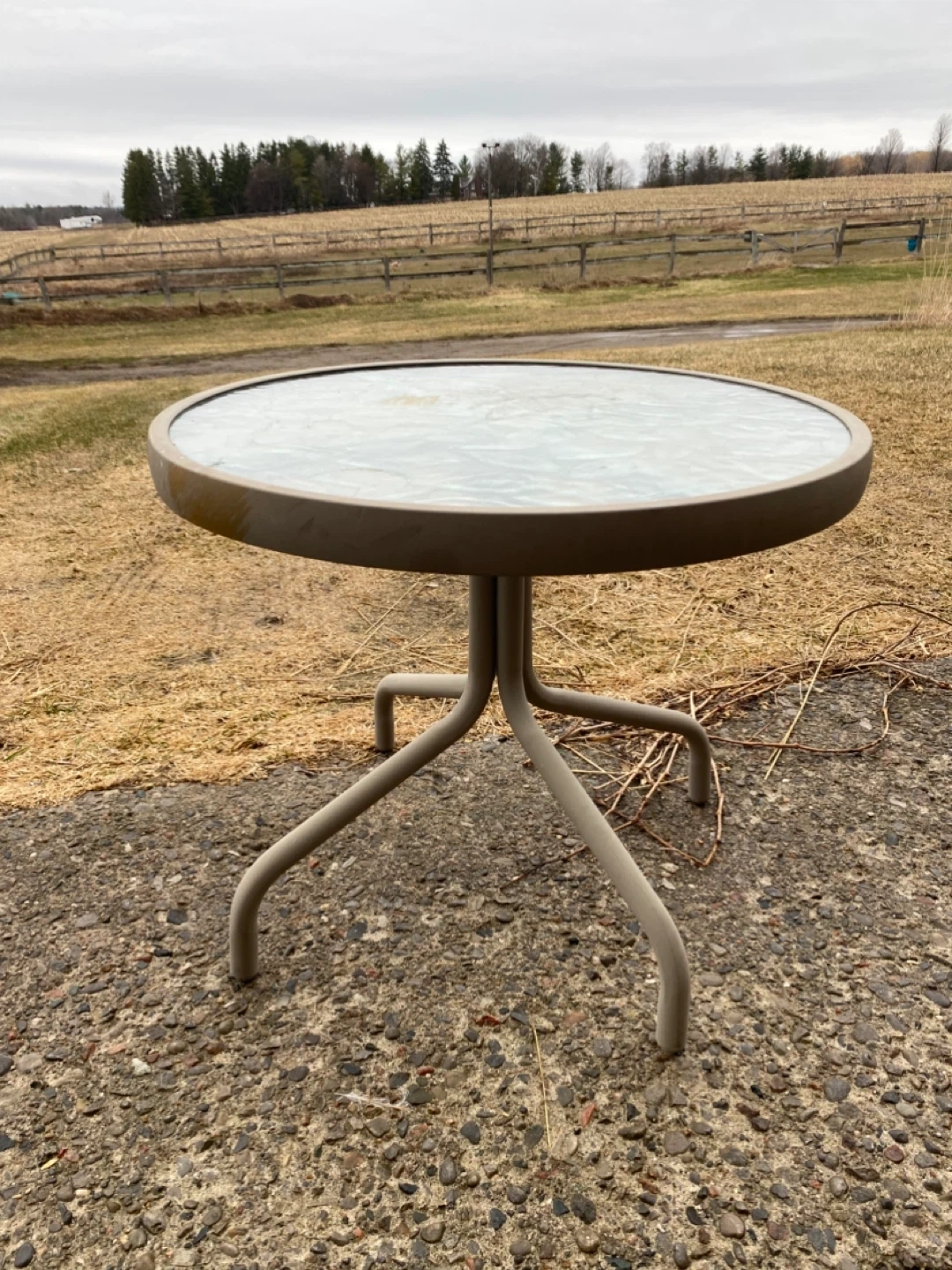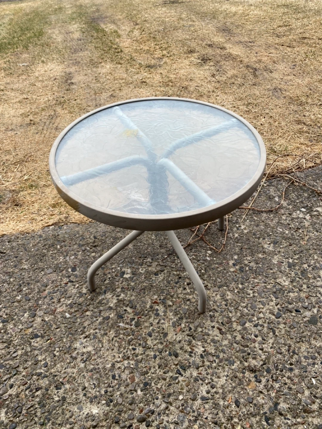 This is a round patio side table with a textured glass top and a metal frame. It's approximately 20 inches in diameter and stands about 18 inches tall. Great for a small outdoor space!