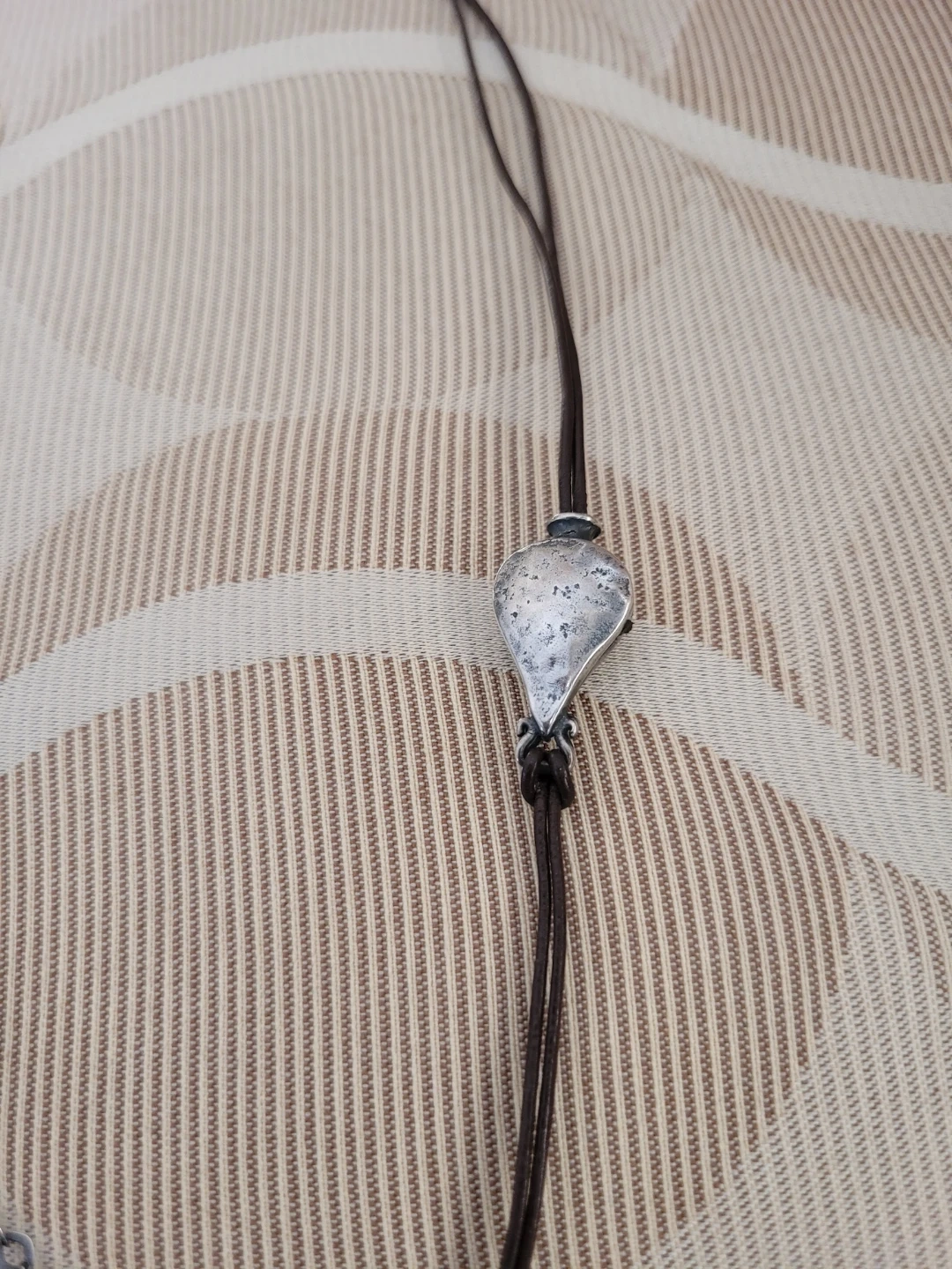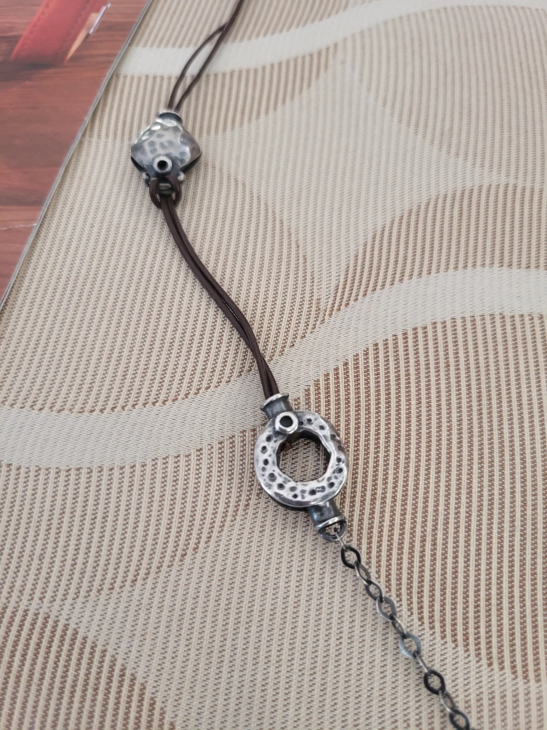 Retired Silpada Oxidized Hammered Silver necklace featuring a textured silver drop pendant on a brown leather cord. It has an orange bead accent. 22' length