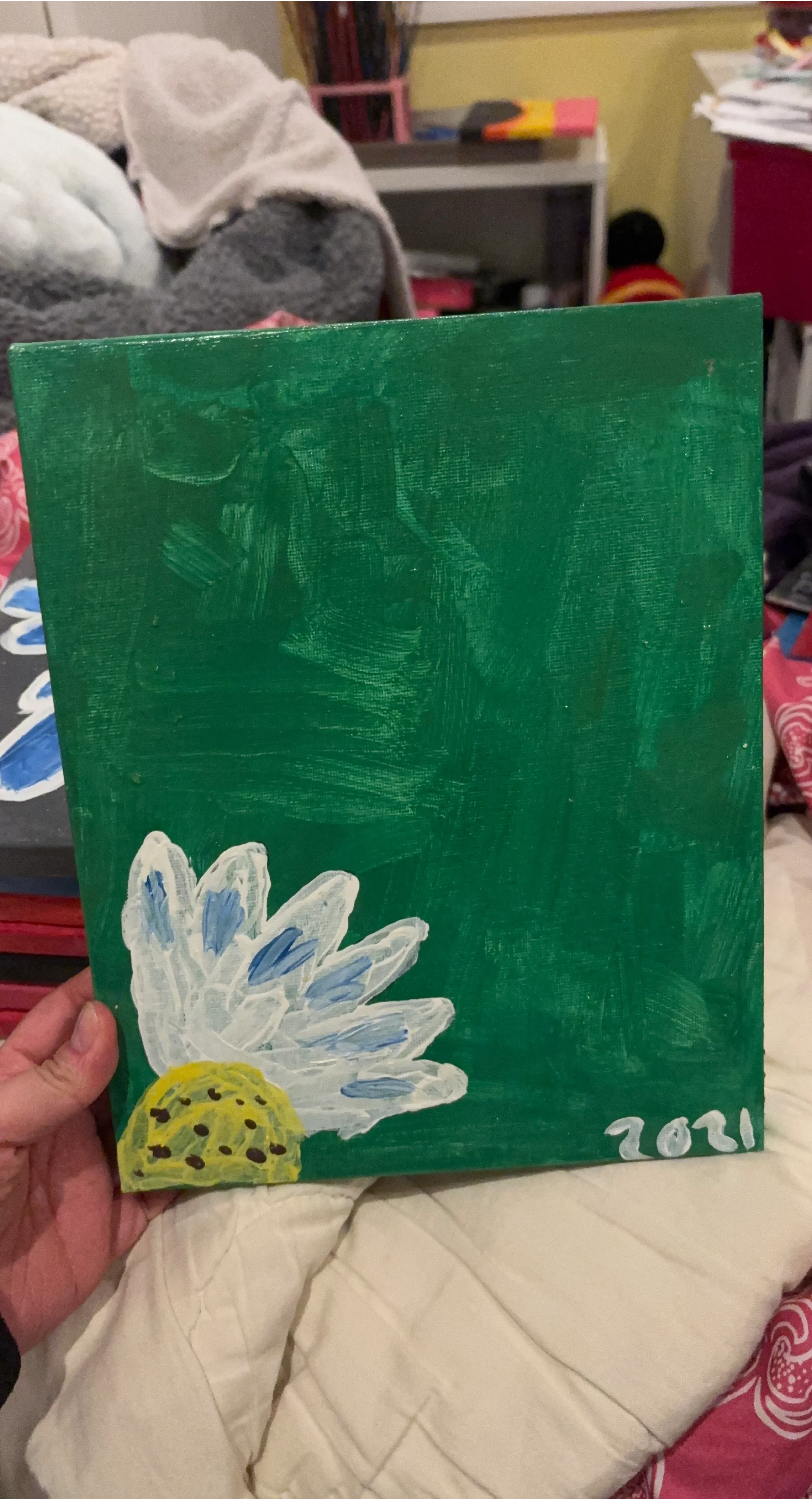 A green painting with a floral design. It appears to be hand-painted, with a white and blue flower and a yellow center. The year '2021' is painted in the corner