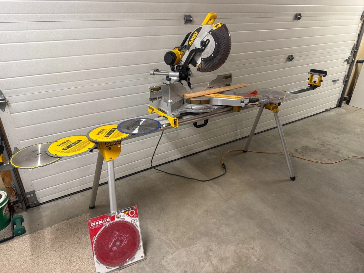 Dewalt 12” Double Bevel Sliding Compound Miter Saw with Stand, Laser, Mounting brackets and extra blades