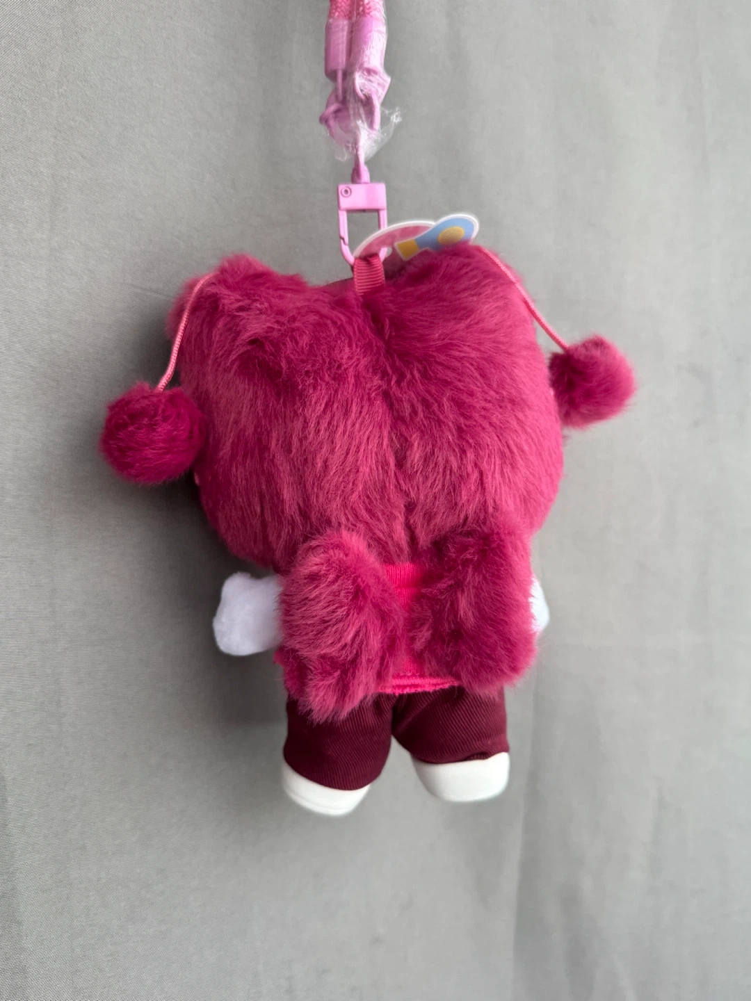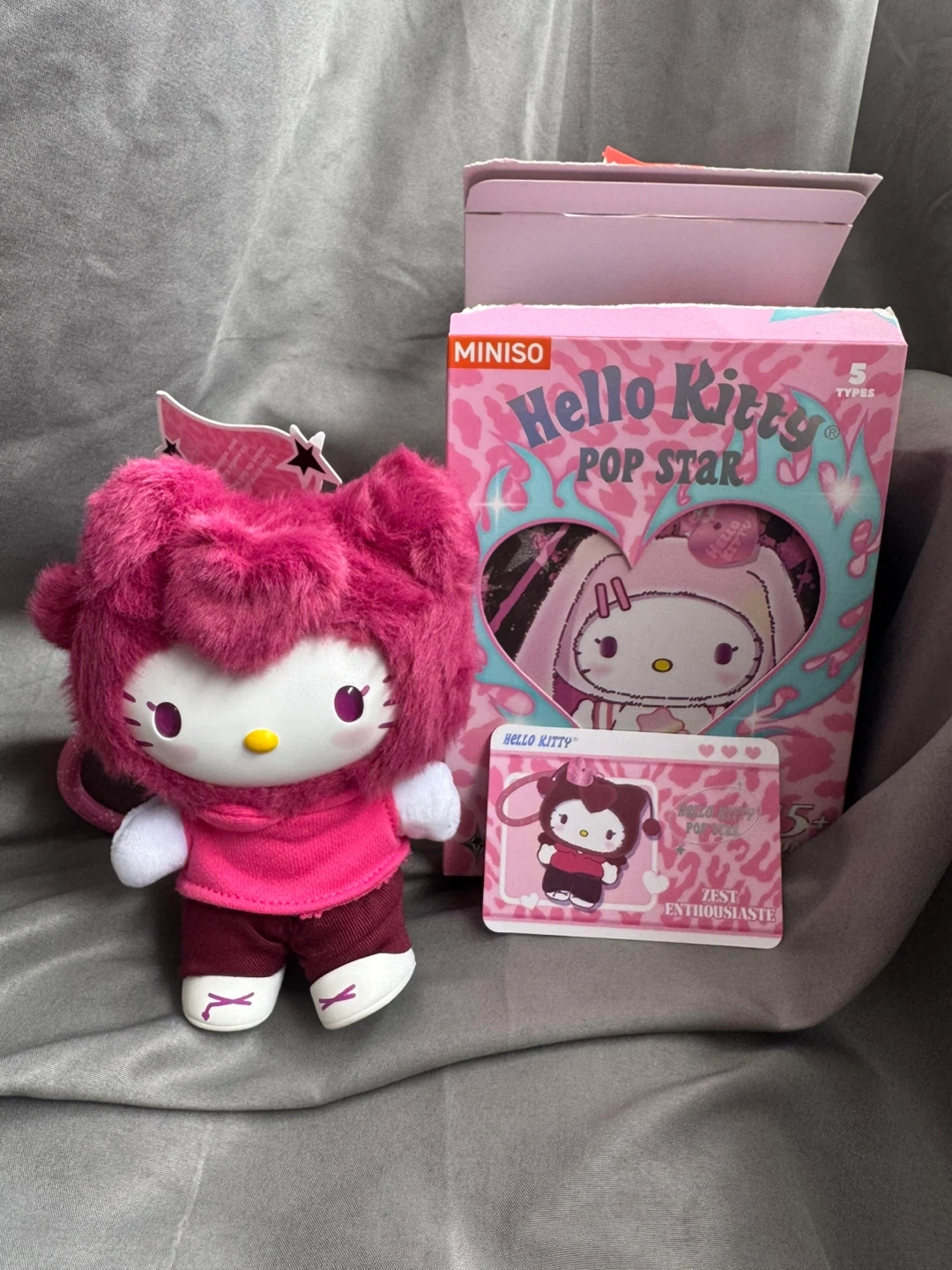 Super cute and fluffy pink Hello Kitty plush charm from MINISO's "Pop Star" collection. It's got a fuzzy pink wig, pink sweater, and maroon shorts. Comes with its original packaging and display card. Perfect for adding some flair to your bag or backpack!