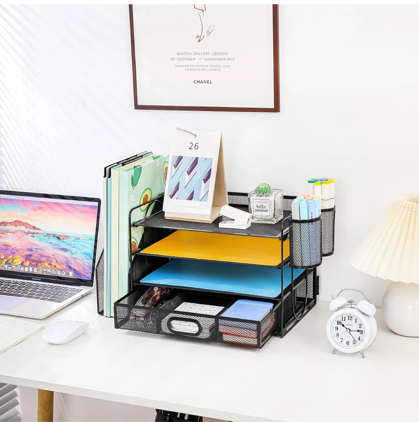 Declutter your workspace with this handy mesh desk organizer! It features multiple tiers and a drawer to keep all your supplies neatly organized.