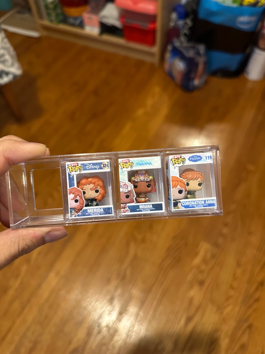 Bitty Pop: Funko Pop! mini figures: Merida, Moana, and Coronation Anna. Comes in a clear display case.