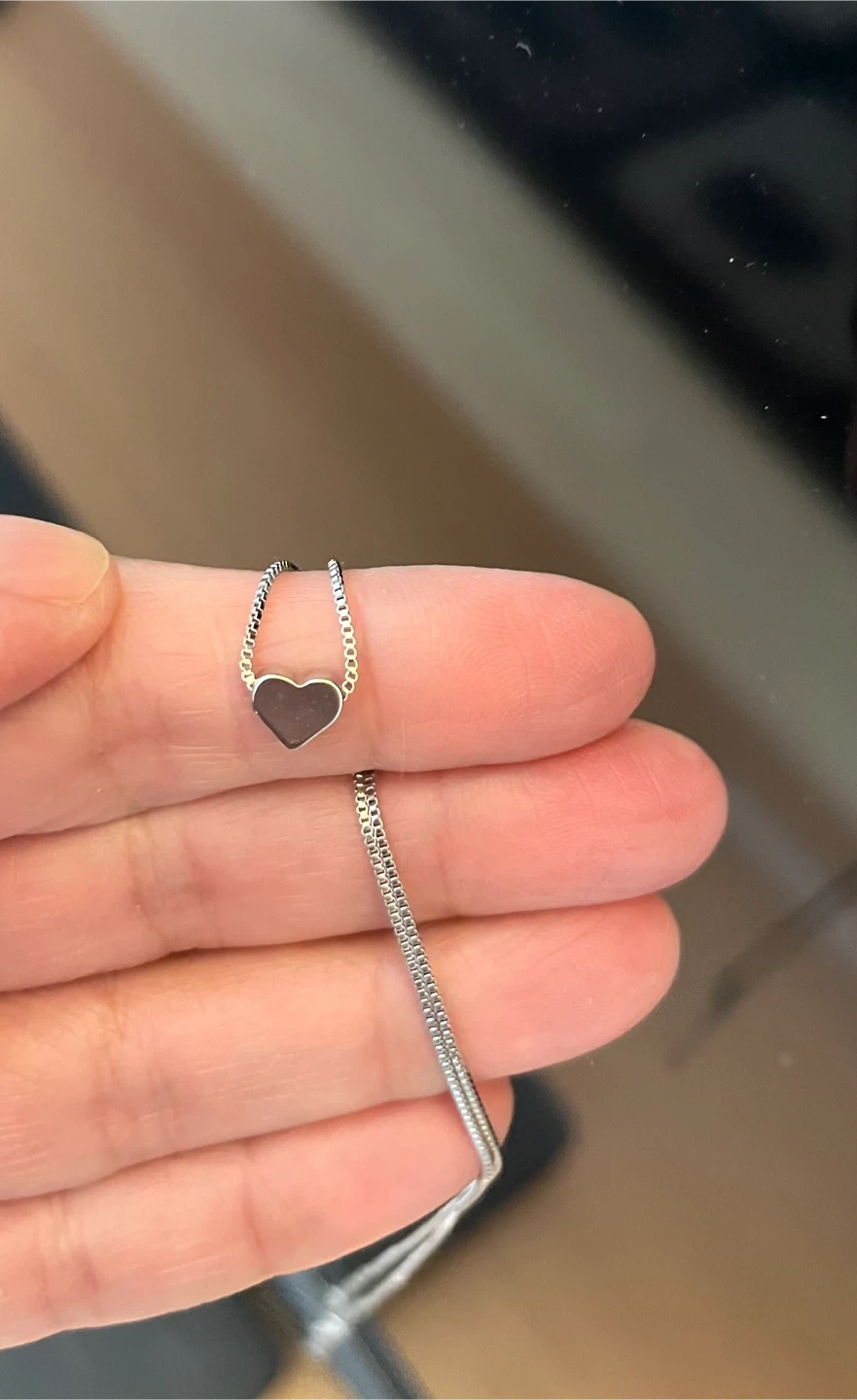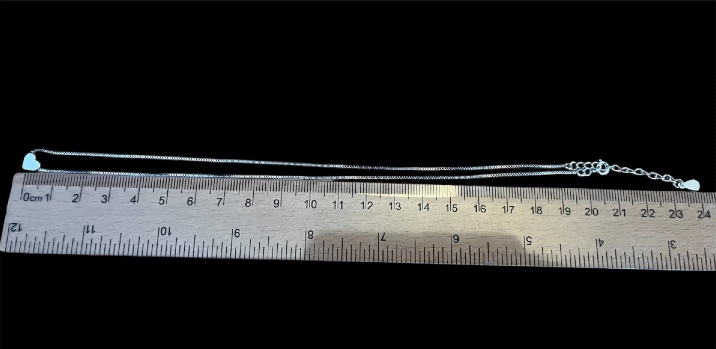 A delicate silver necklace with a heart pendant. It's approximately 18 inches long with an adjustable clasp. The chain is a fine box link style.