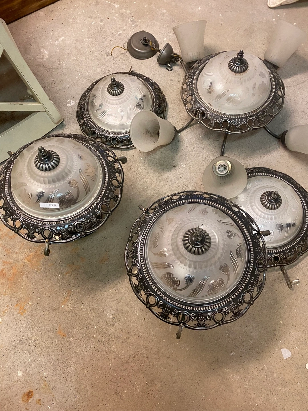 Selling a vintage-style ceiling light fixture with a decorative metal frame and frosted glass shades. It has five lights and would add a unique touch to any room. The fixture is in good condition and comes with all the necessary hardware for installation