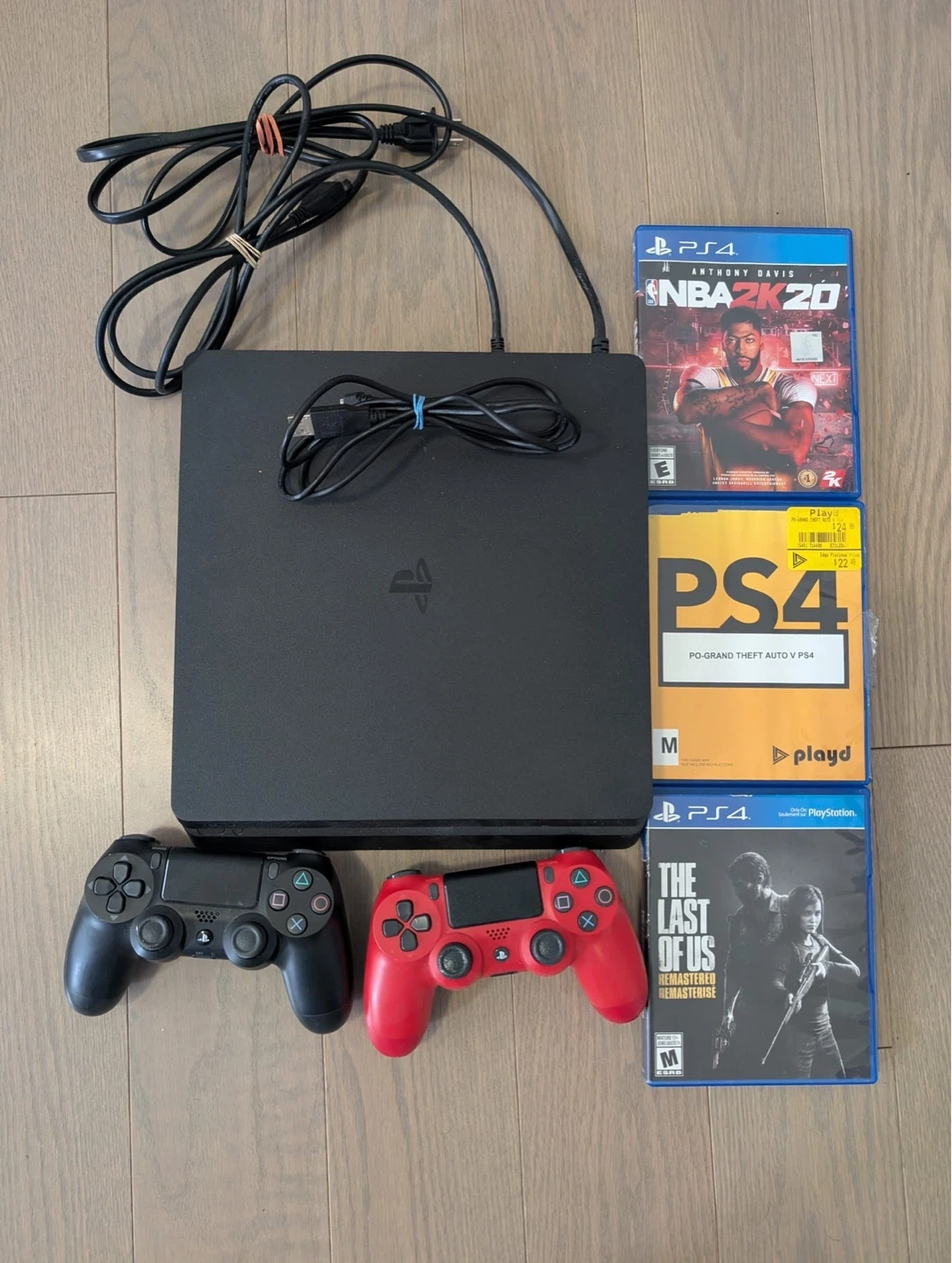 This is a PlayStation 4 Slim console in black. It comes with two DualShock 4 controllers, one black and one red. Also included are the games NBA 2K20, Grand Theft Auto V, and The Last of Us Remastered. All necessary cables are included.