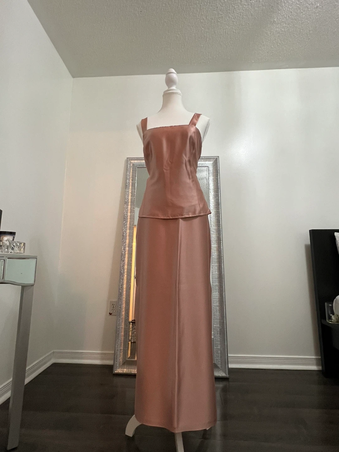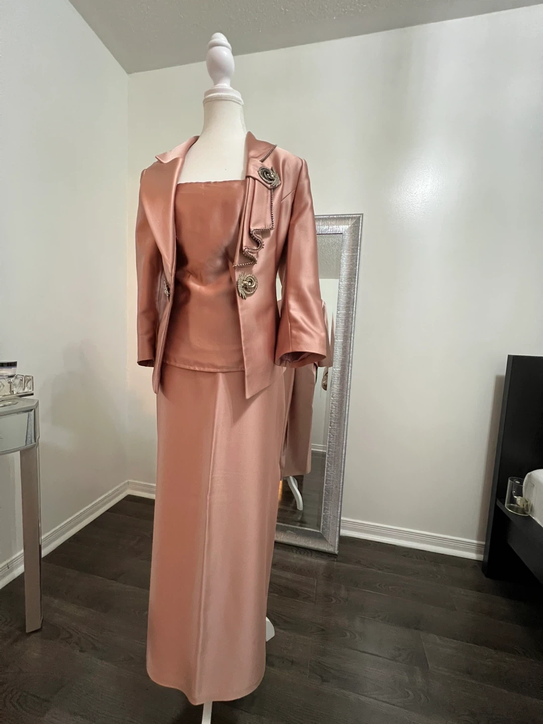 This elegant three-piece suit features a rose gold satin fabric. It includes a sleeveless top, a matching long skirt, and a coordinating blazer adorned with intricate embellishments. The blazer has a stylish lapel and decorative brooches.