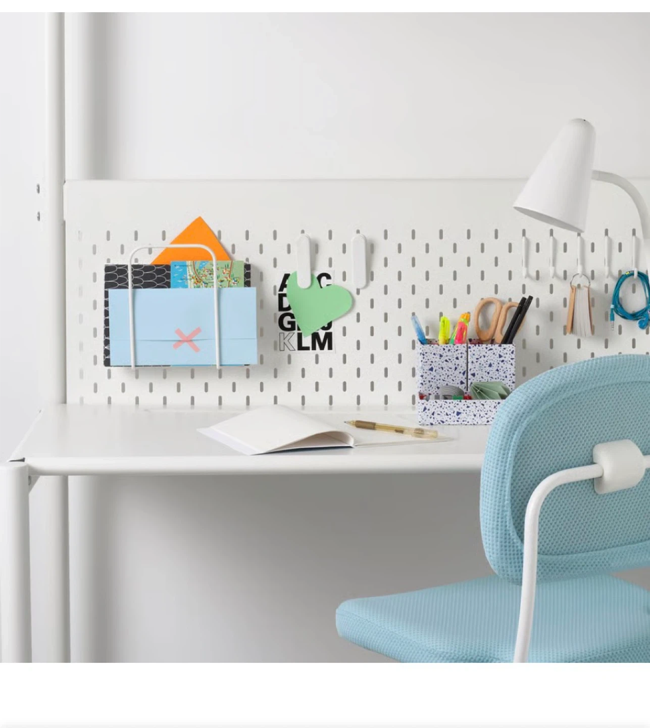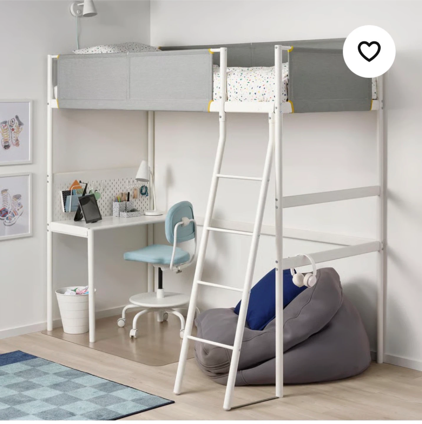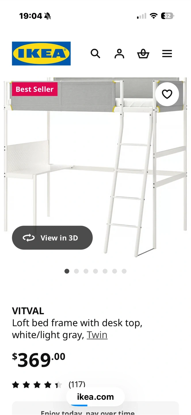 This is an IKEA loft bed featuring a built-in desk and a ladder for easy access. It's white and includes the desk surface and railings. The total height is 195 cm and the length is 197 cm.