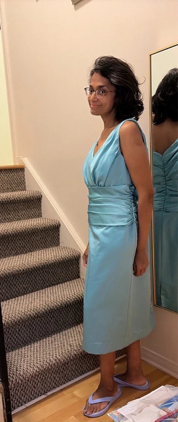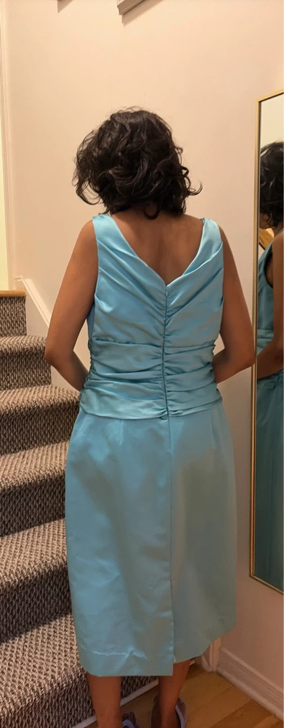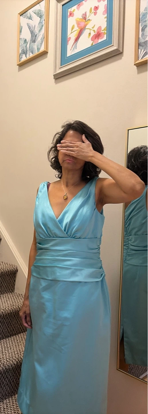 Used once. This lovely shiny turquoise blue bridesmaids dress with ruched waistband by David’s Bridal can be yours. Washed. Pet and smoke free home. Size 12