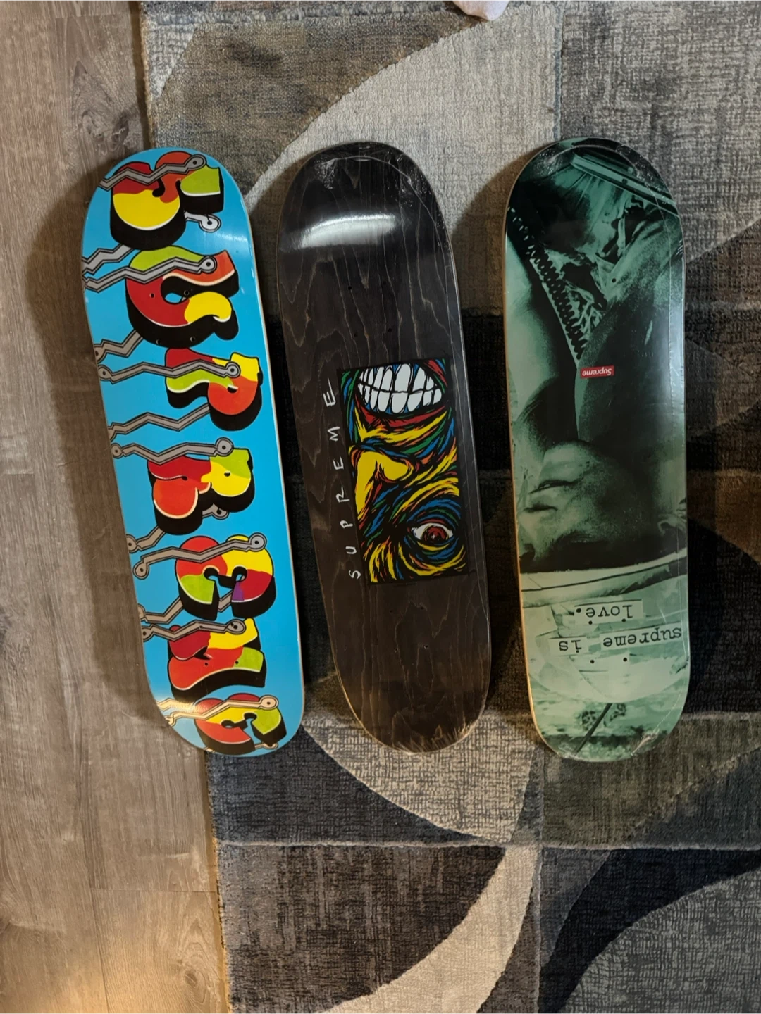 Three Supreme skate decks with distinct graphics. Features a blue deck with 'Supreme' lettering, a black deck with a colourful eye graphic, and a green deck with a face. Deck designs vary.