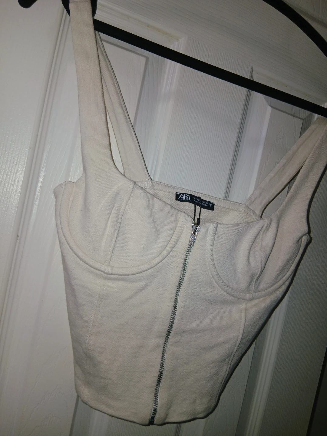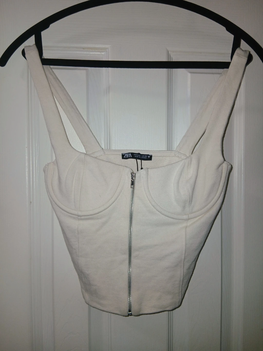 Cream-coloured corset top from ZARA. It features a zippered front and a fitted silhouette.