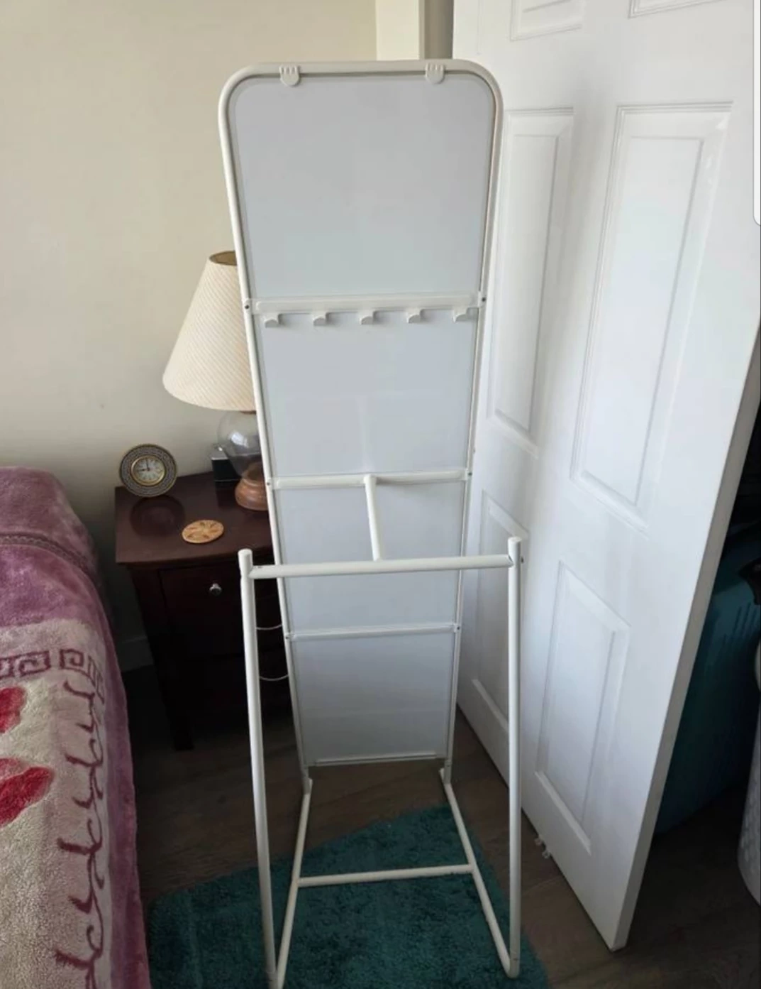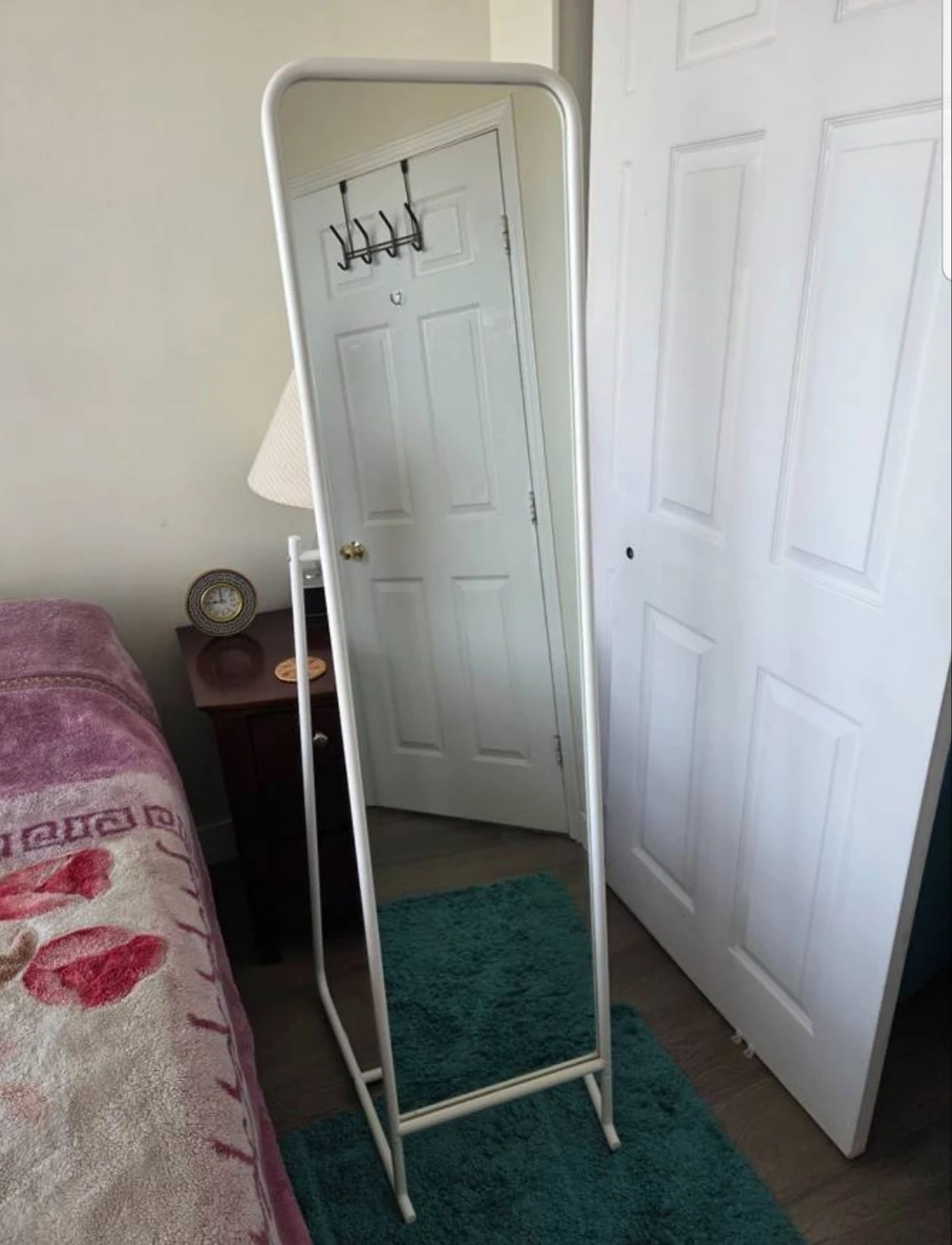 Selling a full-length standing mirror in great condition! It's perfect for checking out your outfit before heading out. The mirror has a clean, white frame that will fit in with any decor. It also has hooks on the back for hanging clothes or accessories