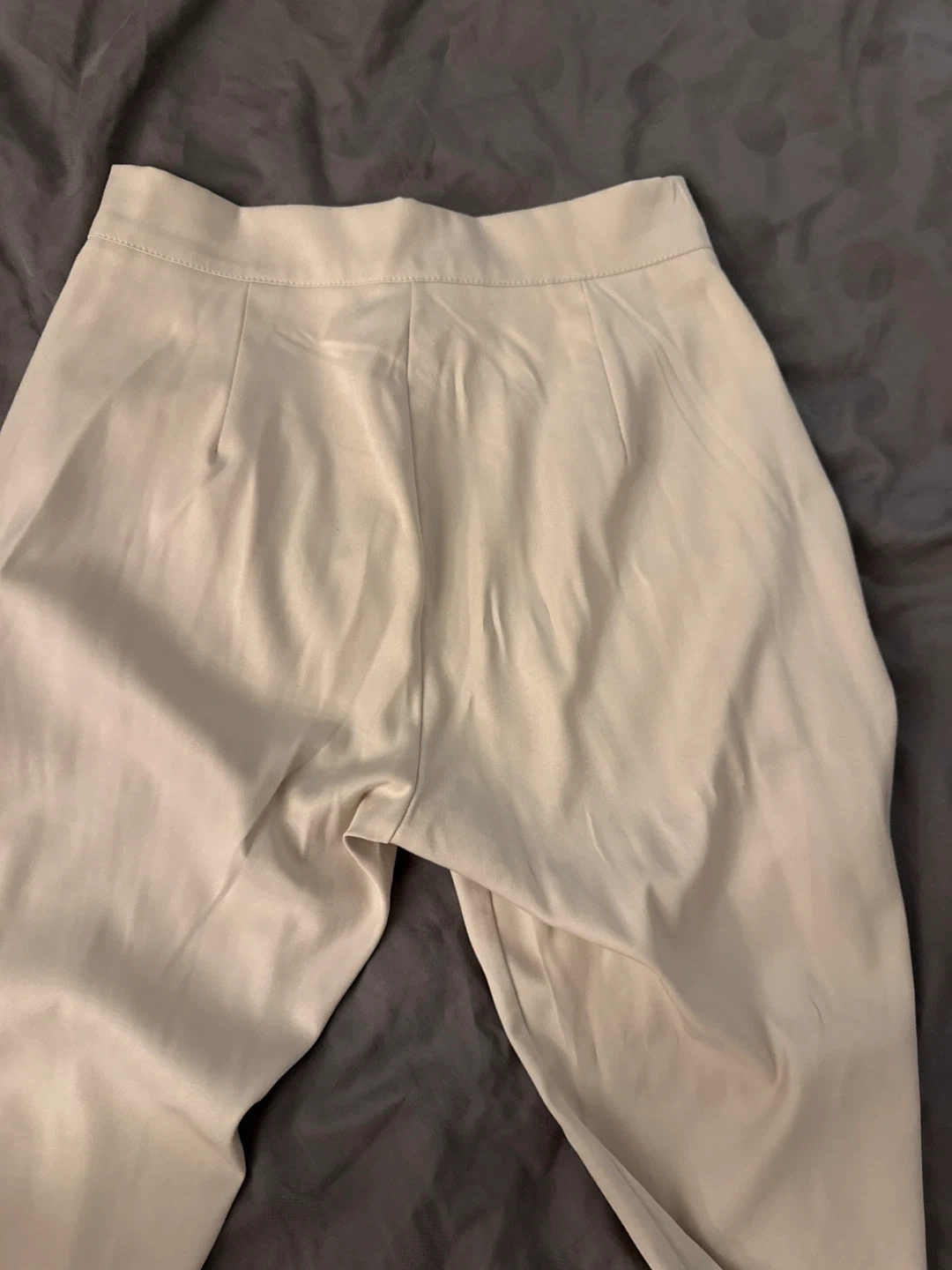 These beige trousers feature a flared leg design. They have a classic button and zipper closure. The material is a smooth, light fabric.