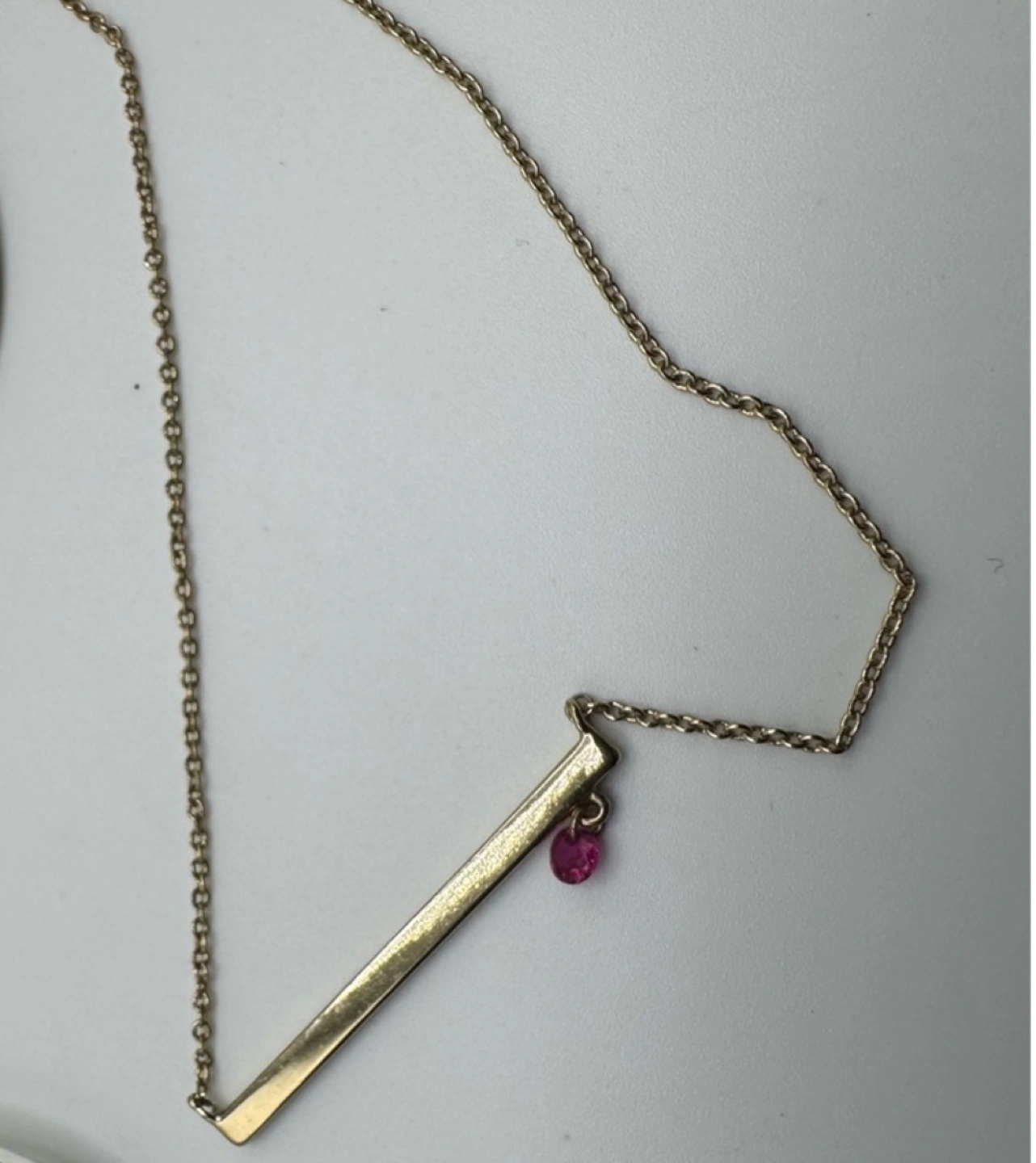 Delicate gold necklace. Features a small bar pendant and a tiny pink gemstone. Fine chain. Clasp closure.