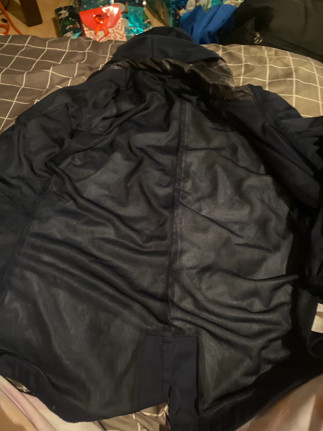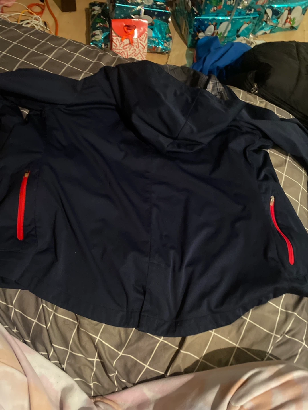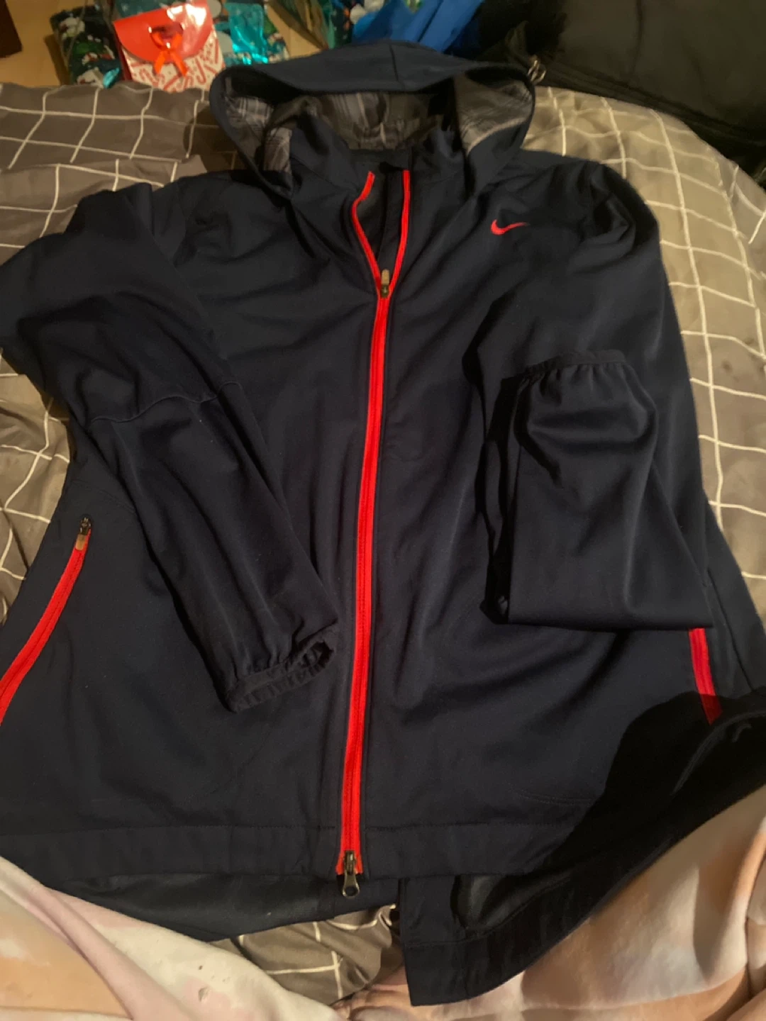 Selling a Nike jacket in navy blue with red zipper and accents. It's a full zip jacket with a hood. Great for layering or wearing on its own!