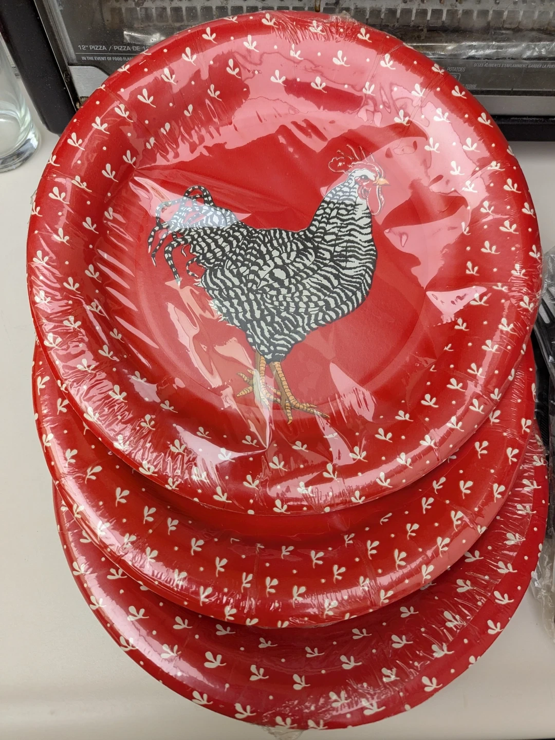 3 packs 10" red paper plates featuring a farmhouse-style rooster design (10 counts in each) including some disposable utensils.
